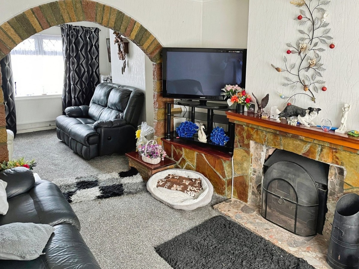 3.37m x 7.10m (11' 1" x 23' 4") Window overlooking the front and rear, two radiators, slate tiled fireplace with solid fuel burner. TV shelving.