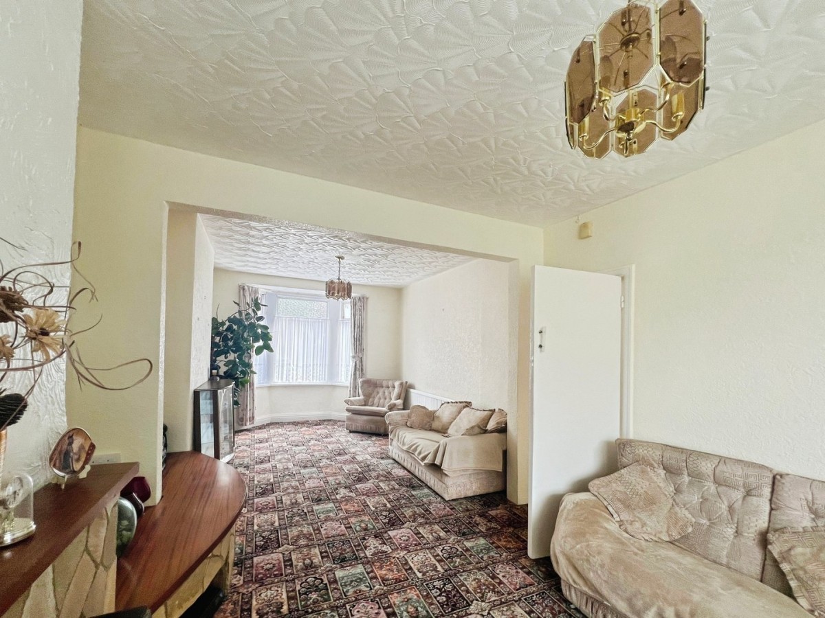 Artexed ceiling. Paper walls. Front facing PVC double glazed window set within a bay. Rear facing pvcu double glazed window set within bay. Two Radiators. Fitted carpet. Stone tiled hearth and wooden mantle. Inset gas fire.