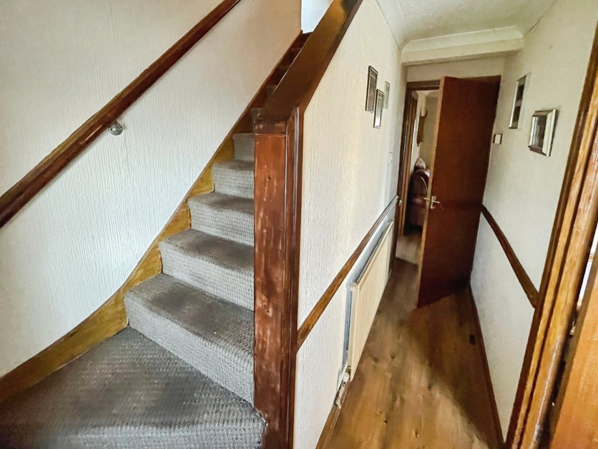 Stairs leading to the first floor, papered ceiling and walls, coving, laminate flooring and radiator. Door leading into the lounge and reception 2 / dining room.