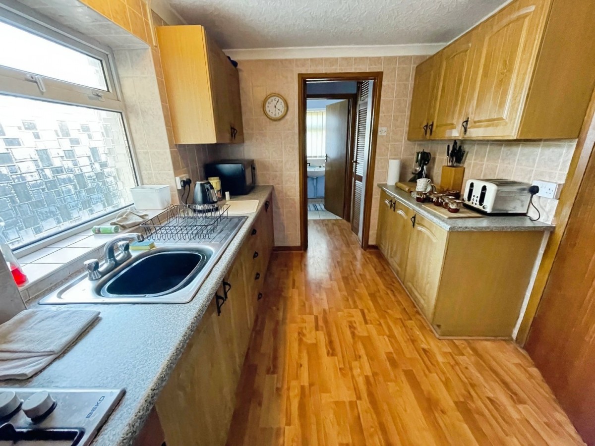 2.40m x 3.11m (7' 10" x 10' 2") Flooring to ceiling tiled walls, opaque double glazed PVCu window to the side and laminate flooring, A range of matching wall and base units with complementary work surfaces housing a single drainer stainless steel sink, integrated four ring gas hob and electric double oven. Storage cupboard with PVCu opaque window to the side, floor to ceiling tiled walls, tiled flooring and shelving. Doors leading into the utility and wet room.