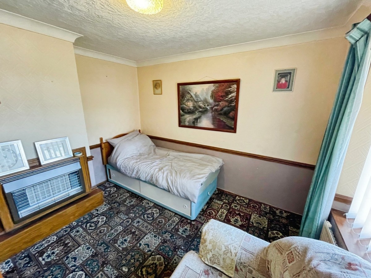3.88m x 2.37m (12' 9" x 7' 9") PVCu double glazed window to the rear, coving, radiator, papered walls and fitted carpet.