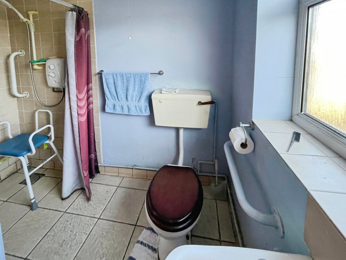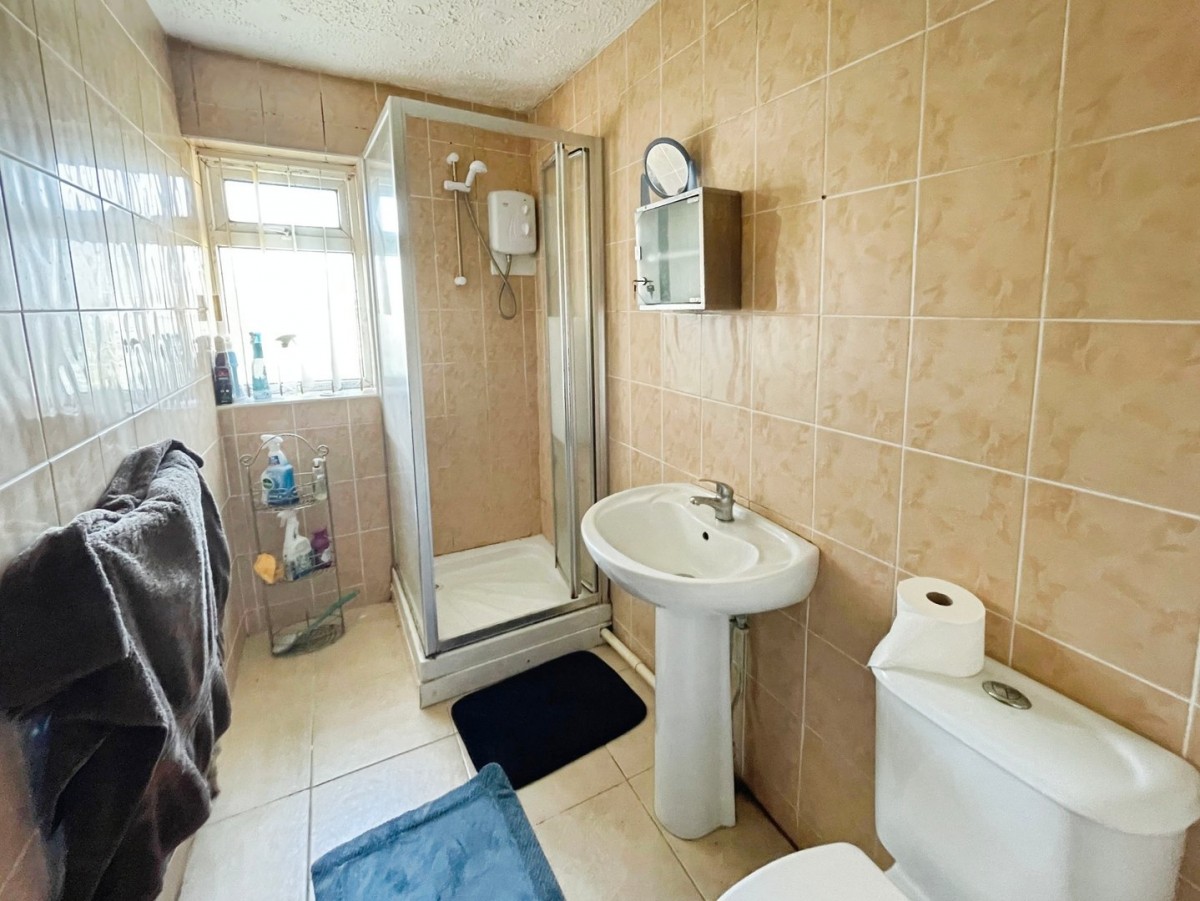 2.33m x 2.28m (7' 8" x 7' 6") max. Three piece suite comprising low level WC, wash hand basin and shower with electric attachment. Extractor hood, emulsioned walls, radiator, tiled flooring and PVCu opaque double glazed window to the rear.