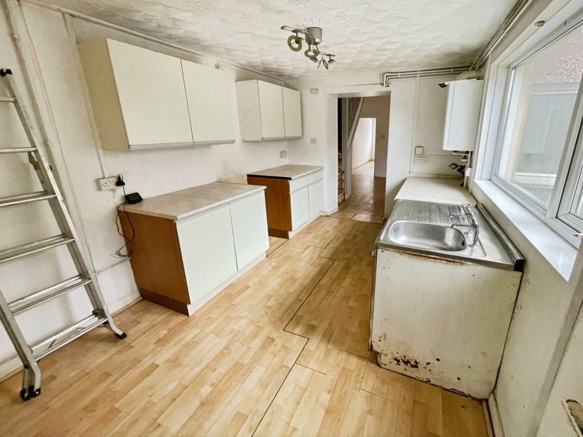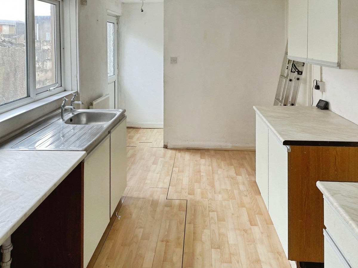 2.42m x 3.66m (7' 11" x 12' 0") PVCu double glazed window overlooking the side of the property, PVCu opaque glazed door to the side, radiator, emulsioned walls and laminate flooring. Stainless steel sink with single drainer. Wall mounted Ideal combination boiler. A range of wall and base units with complementary roll edge work surfaces. Door leading to downstairs bathroom.