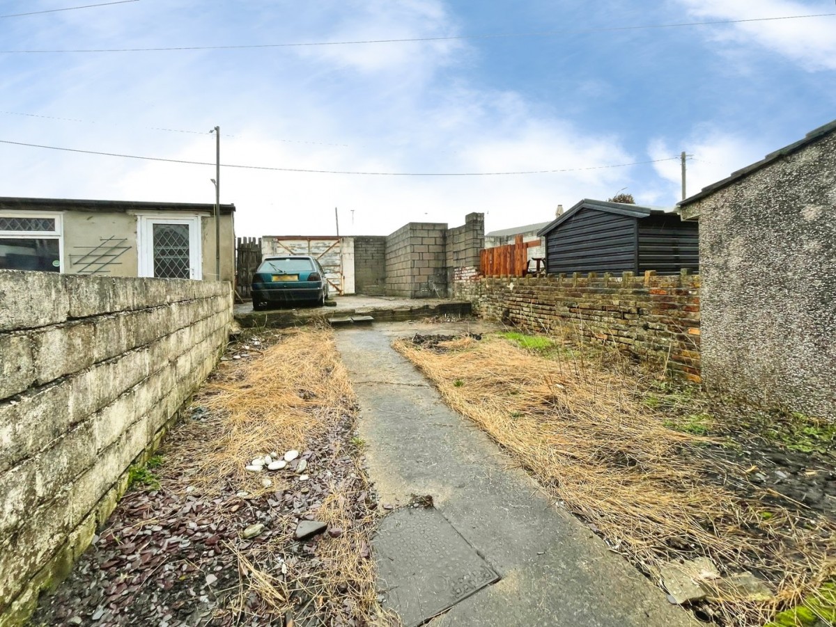 The rear garden is laid to courtyard with steps leading up to lawned area, slate chippings and further steps leading up to a parking area with gated access to the rear lane.