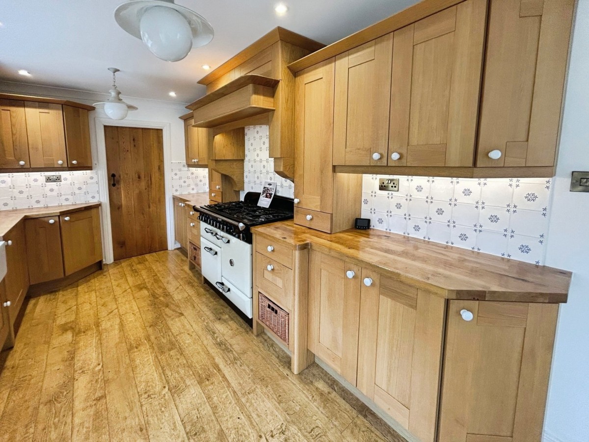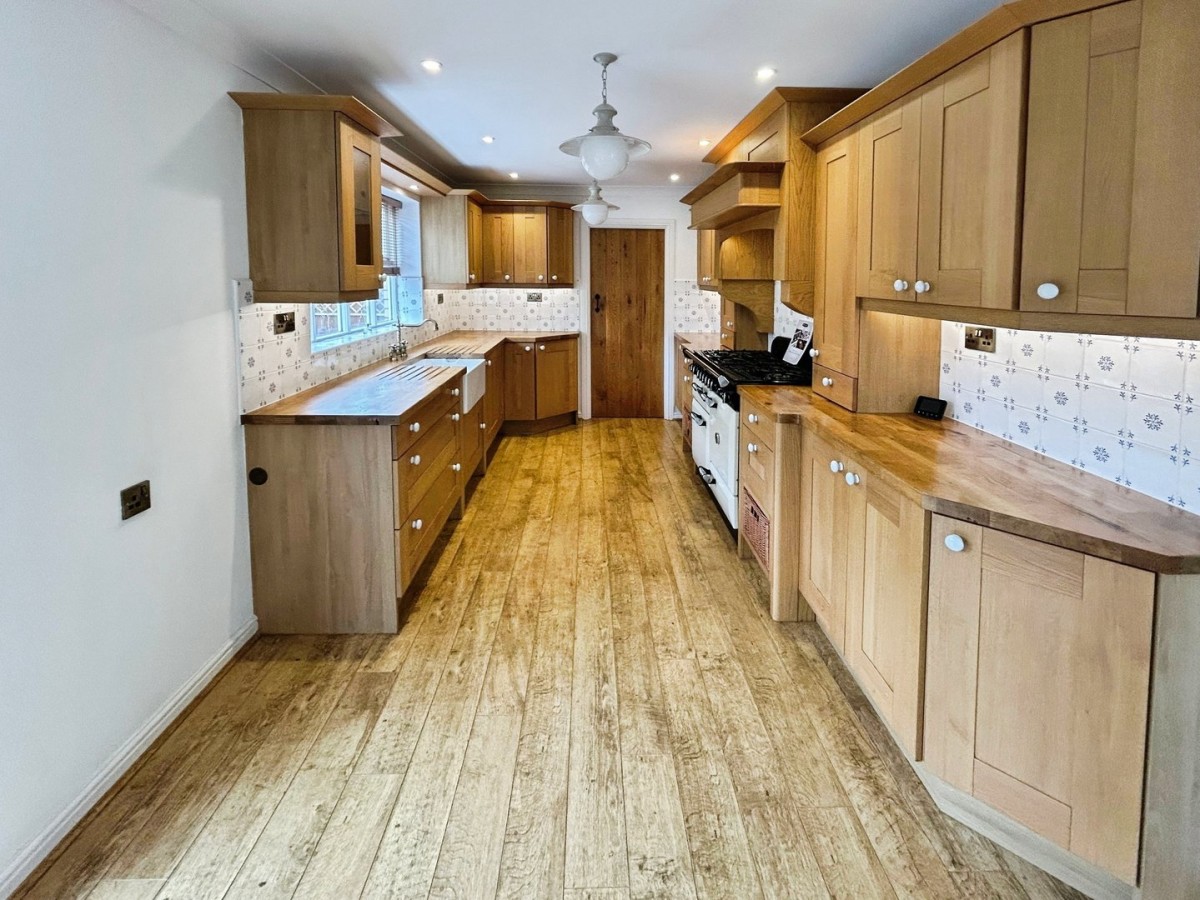 Emulsioned and coved ceiling with inset spot lights and two pendant lights, emulsioned walls with ceramic tiles to splash back areas, radiator and wood effect laminate flooring. A range of solid wood bespoke wall and base units with solid wood worktops. Belfast sink with brass mixer tap. Rangemaster double oven with six ring gas hob. Space for side by side upright American style fridge/freezer. Door to utility.