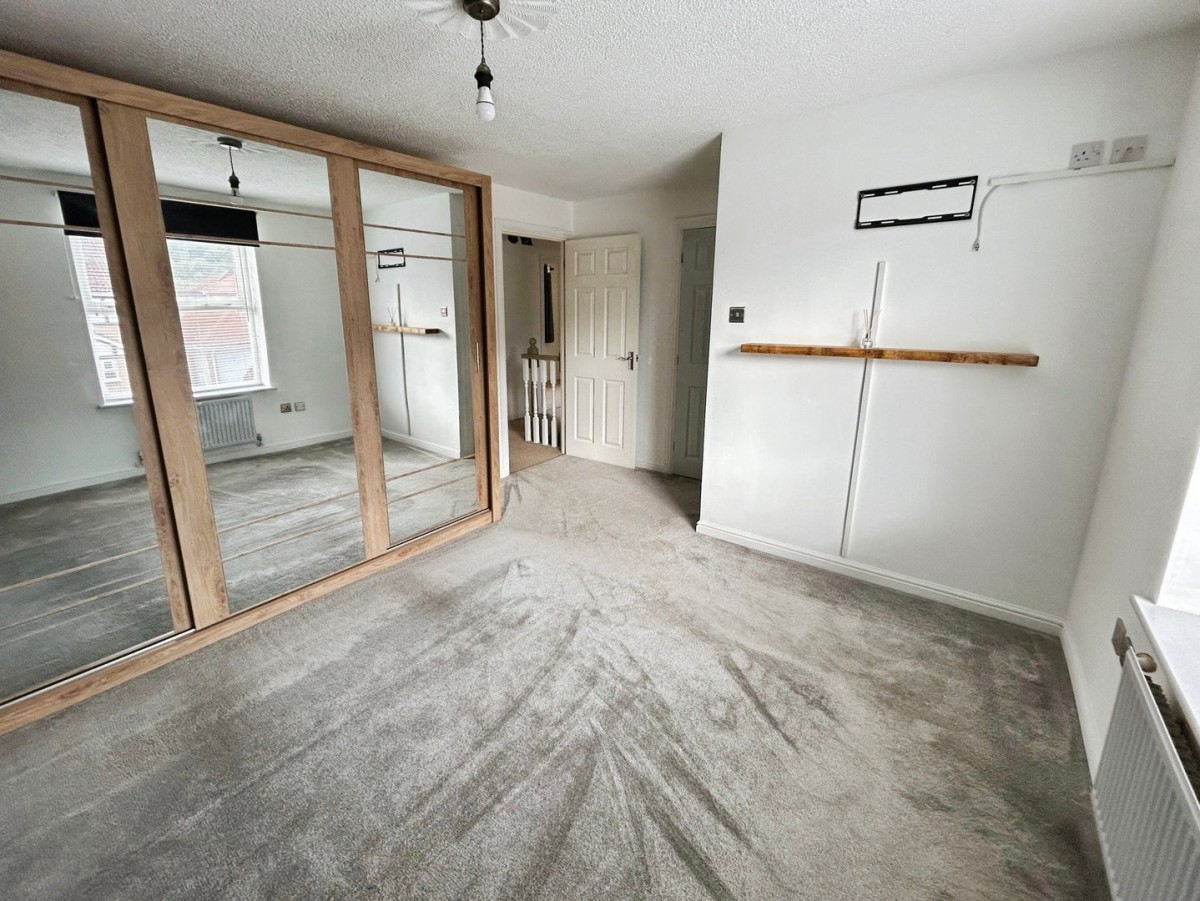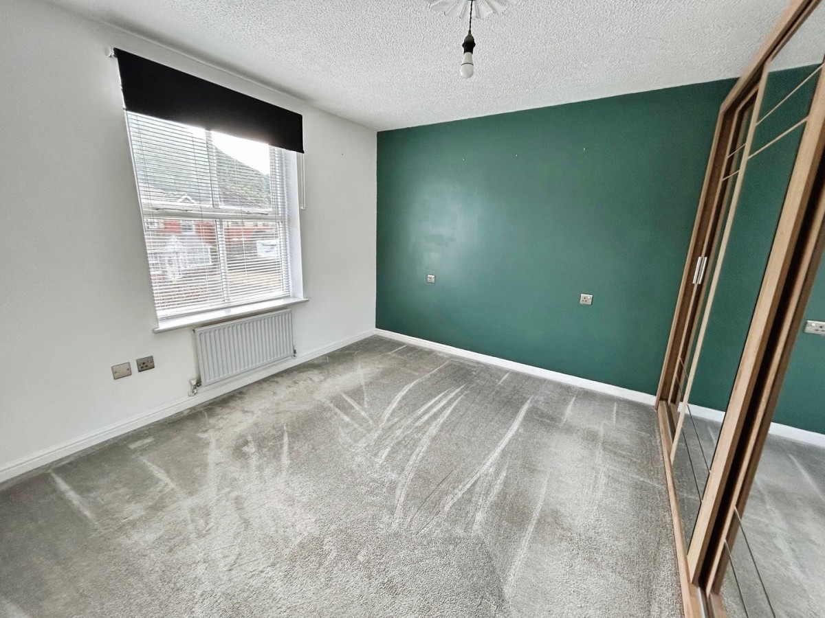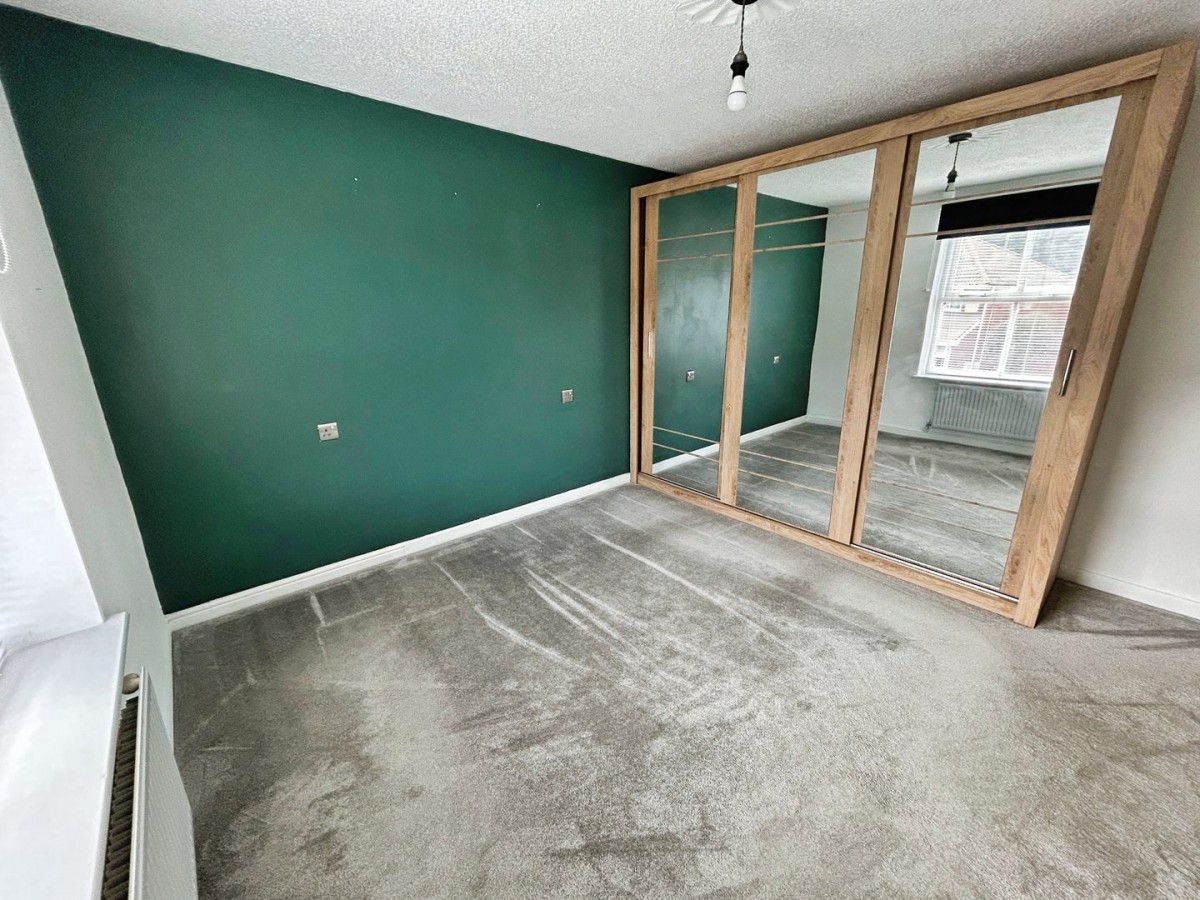 Stippled ceiling, pendant light, emulsioned walls, radiator, timber framed double glazed window overlooking the rear of the property with fitted Venetian blind, curtains, curtain pole and fitted carpet.