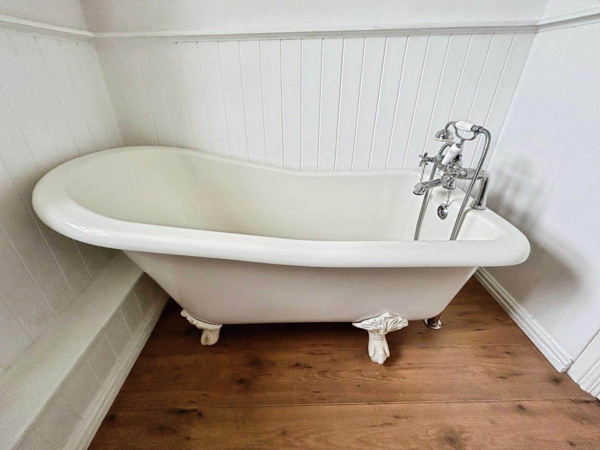 Stippled ceiling, flush light fitting, emulsioned walls with part painted wood panelling, radiator, frosted timber framed double glazed window overlooking the rear of the property with wooden shutters, wood effect laminate flooring. Three piece suite in white comprising WC, pedestal wash hand basin with chrome taps and roll top slipper style bath with claw feet and chrome mixer tap with shower attachment.