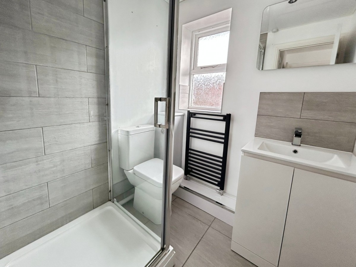 Respatex panelled ceiling with inset spot lights, emulsioned walls with ceramic tiles to splash back areas, timber framed frosted double glazed window overlooking the front of the property, matt grey wall mounted heated towel rail and ceramic tiled flooring. Three piece suite in white comprising WC, wash hand basin with mixer tap set within a white vanity unit and corner shower with mains fed wall mounted chrome rainfall head shower and screen doors.