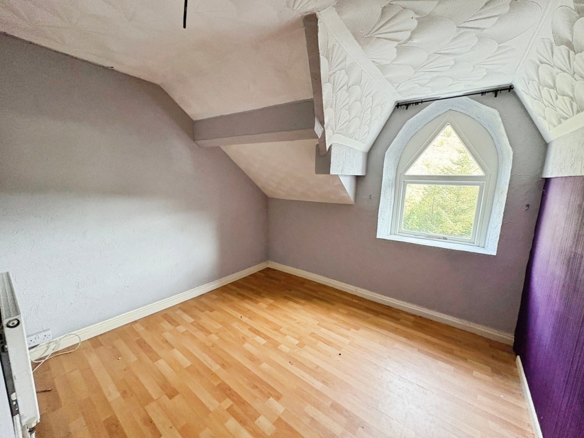 2.92m x 3.14m (9' 7" x 10' 4") Artexed ceiling with ceiling light, feature timber framed window with lovely Afan valley views, papered walls, radiator and laminate flooring.