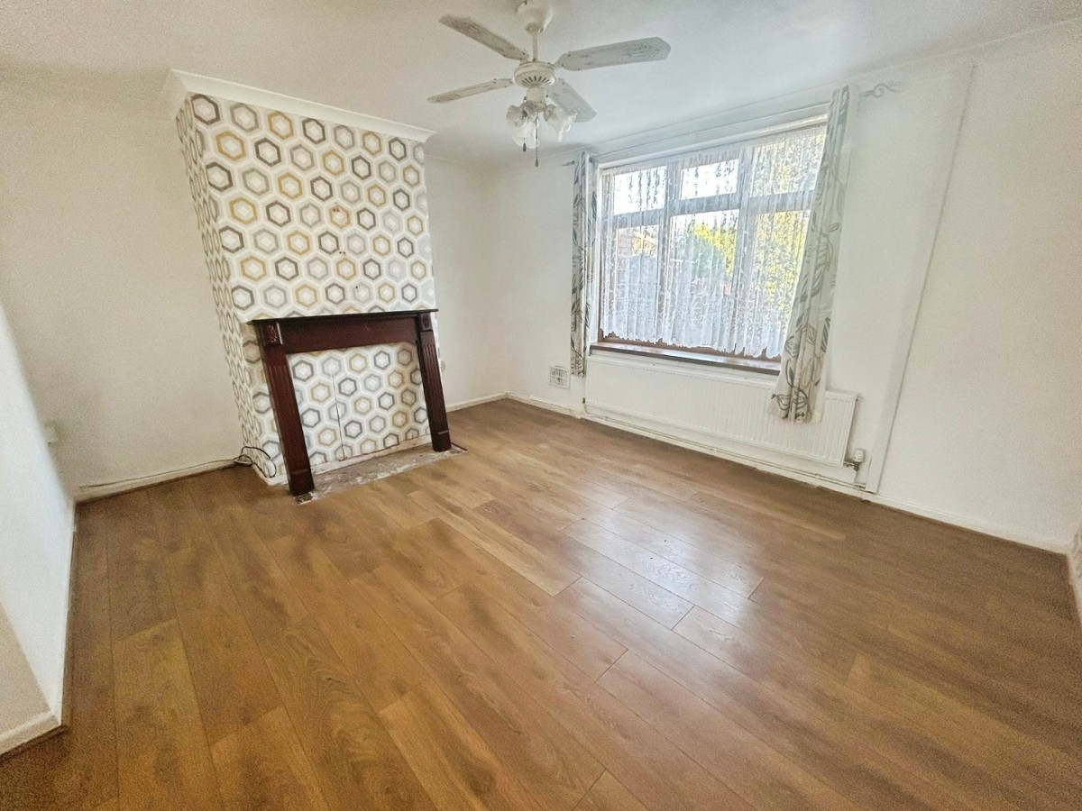 Stippled and coved ceiling, central ceiling fan light, emulsioned walls with feature papered chimney breast, rear facing oak effect PVCu double glazed window, curtain pole and curtains, radiator and wood effect laminate flooring. Wooden fire surround (not fitted).