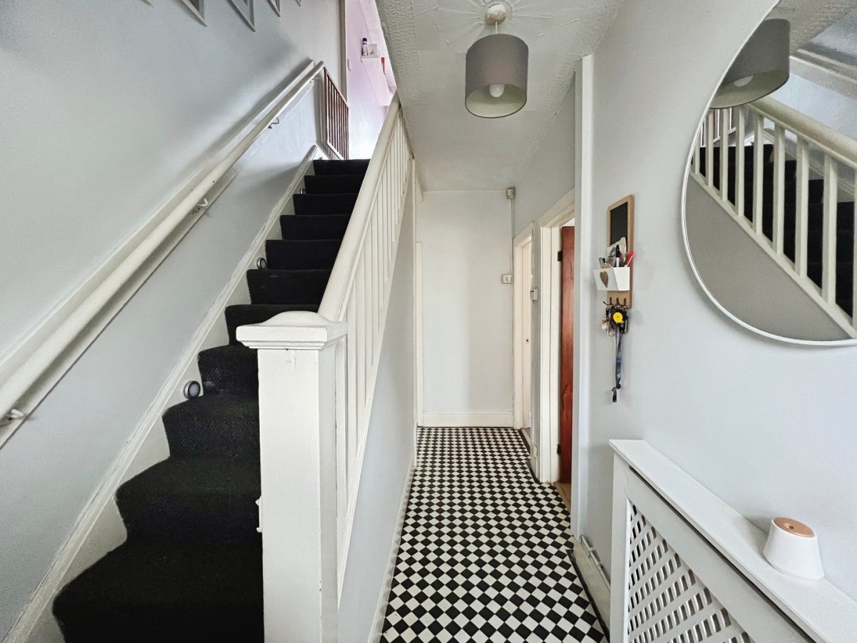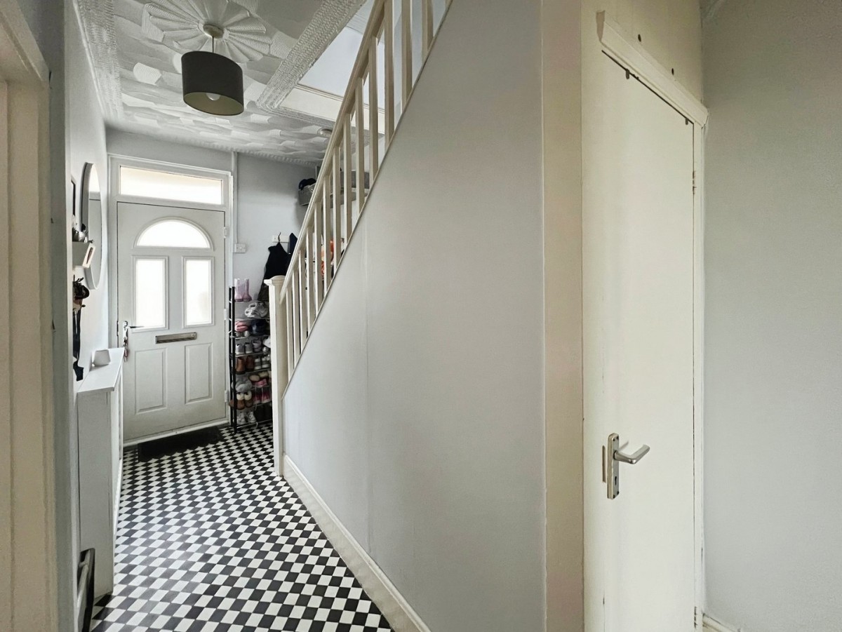 Via part frosted glazed composite door into the entrance hall finished with artexed ceiling, emulsioned walls, radiator and tiled flooring. Stairs leading to first floor. All doors leading off. Door to under stair storage.