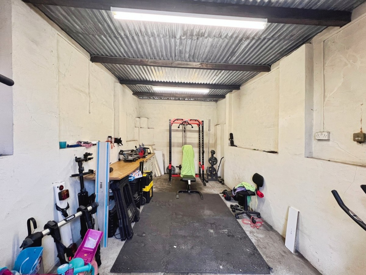 Spacious garage behind the block built shed to the rear with tin roof and concrete flooring. Power installed. Accessed via wooden doors.