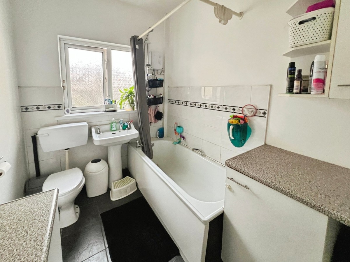 1.91m x 2.65m (6' 3" x 8' 8") Stippled ceiling, emulsioned walls, PVCu frosted double glazed window overlooking the rear of the property, radiator and tiled flooring. Three piece suite comprising low level WC, pedestal wash hand basin and panelled bath wall mounted electric Triton shower.