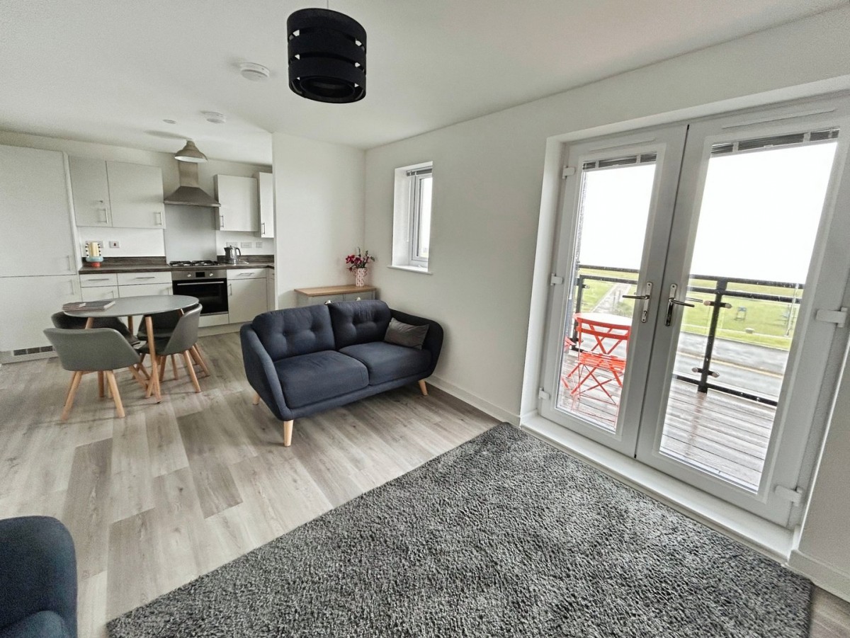 4.90m x 3.24m (16' 1" x 10' 8") Emulsioned ceiling. Pendant light. Emulsioned walls. Wood effect LVT flooring. Front facing PVCu double glazed french doors leading on to balcony area. Front facing PVCu double glazed window with fitted Venetian blinds. Radiator. Opening through into: