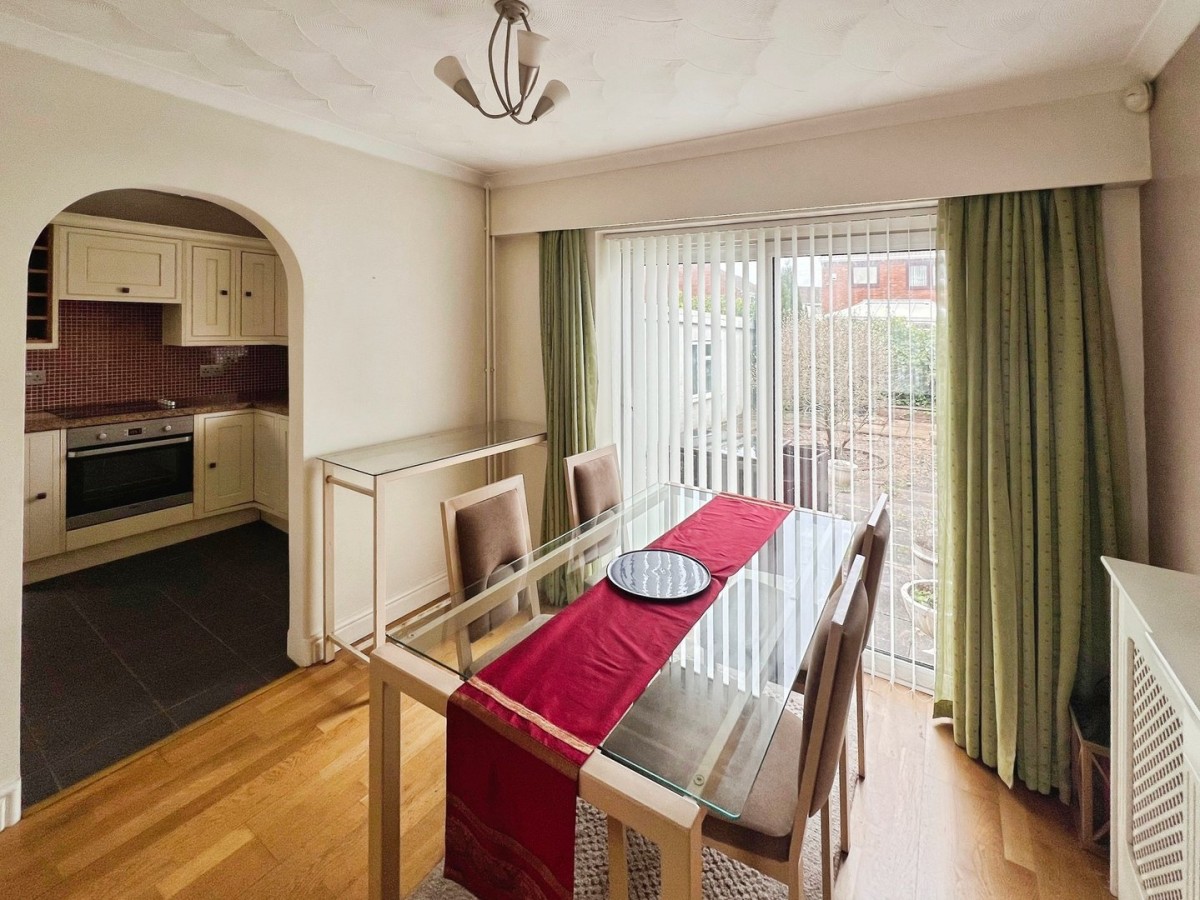 2.49m x 2.90m (8' 2" x 9' 6") Stippled and coved ceiling, emulsioned walls, PVCu sliding patio doors leading out to the rear of the property, radiator and a continuation of the laminate flooring. Ample space for dining table and chairs. Double doors to built in storage cupboard. Arch way leading into the kitchen.