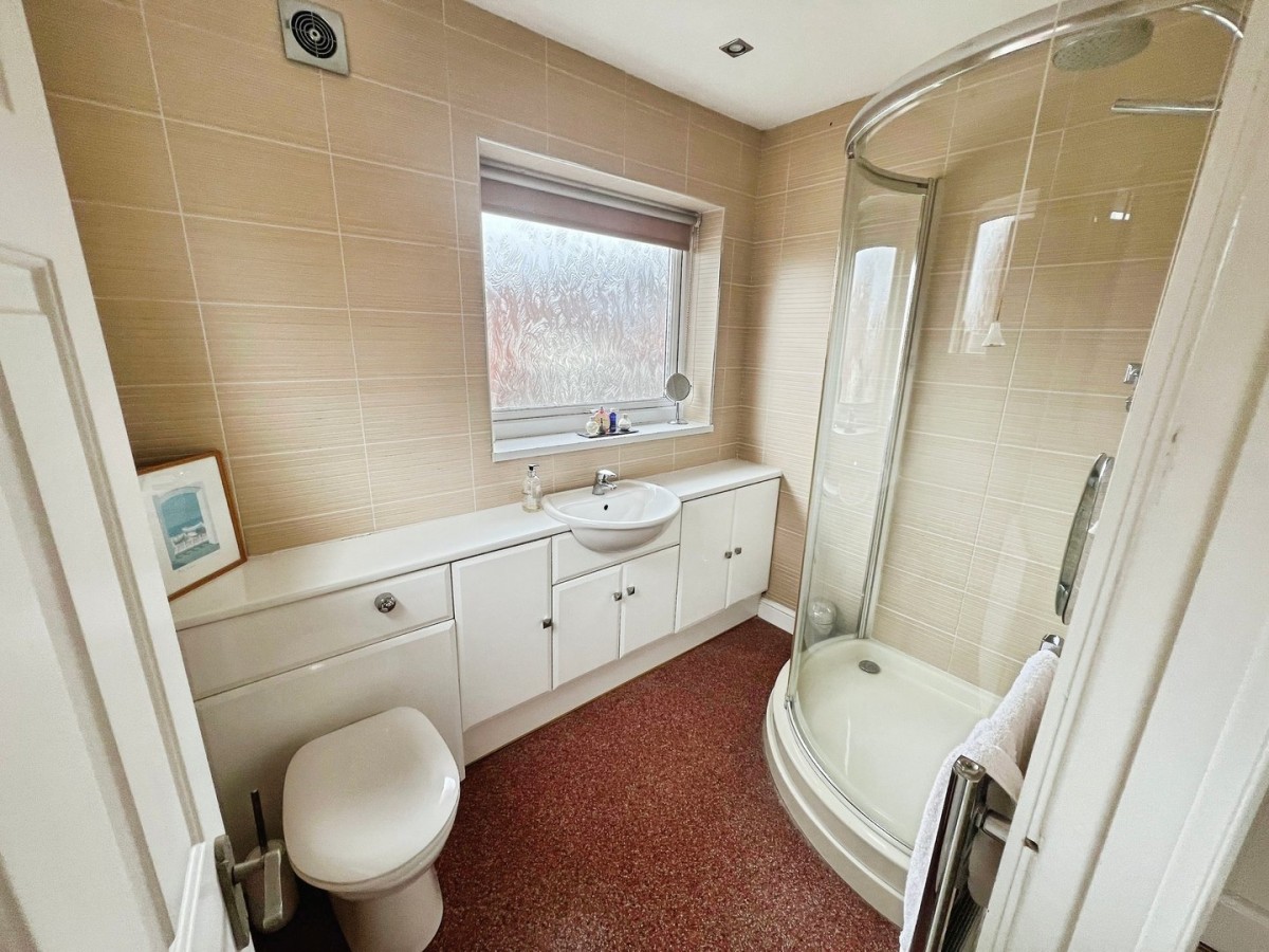Skimmed ceiling, inset spot lights, tiled walls, PVCu frosted double glazed window overlooking the rear of the property and a further PVCu frosted double glazed window to the side, wall mounted chrome towel rail heater and vinyl flooring. Three piece suite comprising WC and sink set within vanity unit with storage and corner shower cubicle with sliding doors and wall mounted chrome mains fed shower with hand held attachment.