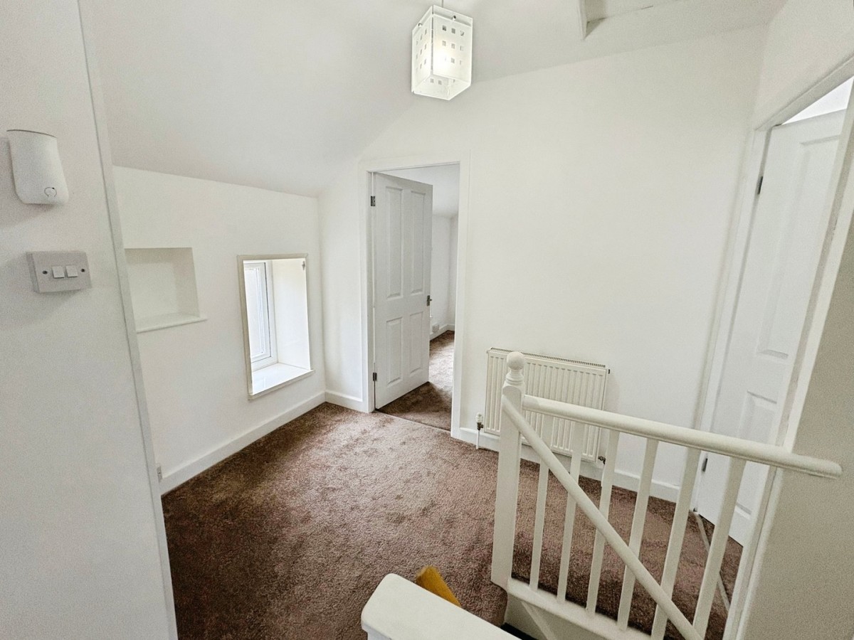 Via stairs with fitted carpet wooden hand rail. Skimmed ceiling, ceiling light, smoke detector, access to loft, emulsioned walls, radiator, PVCu double glazed window overlooking the rear and fitted carpet.