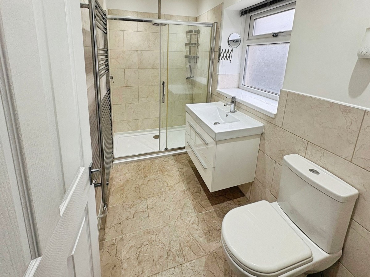 1.38m x 2.74m (4' 6" x 9' 0") Skimmed ceiling with inset spot lights, part emulsioned/part tiled walls, PVCu frosted double glazed window overlooking the rear of the property, wall mounted chrome heated towel rail and tiled flooring. Three piece suite in white comprising low level WC, wash hand basin with vanity unit and a walk in shower with sliding door and overhead rainfall shower.
