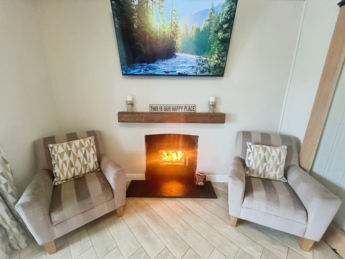 3.76m x 4.35m (12' 4" x 14' 3") Emulsioned and coved ceiling, LED light fitting, emulsioned walls with one painted wood panel feature wall, PVCu French doors leading to the garden with fitted inset Venetian blinds, two side PVCu double glazed windows with fitted Venetian blinds and wood effect LVT flooring. Slate hearth with wooden mantel.