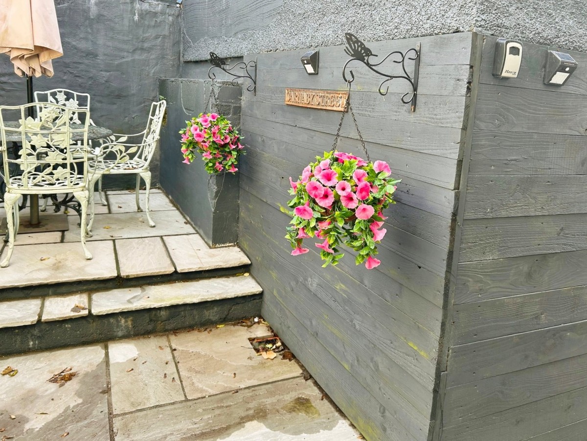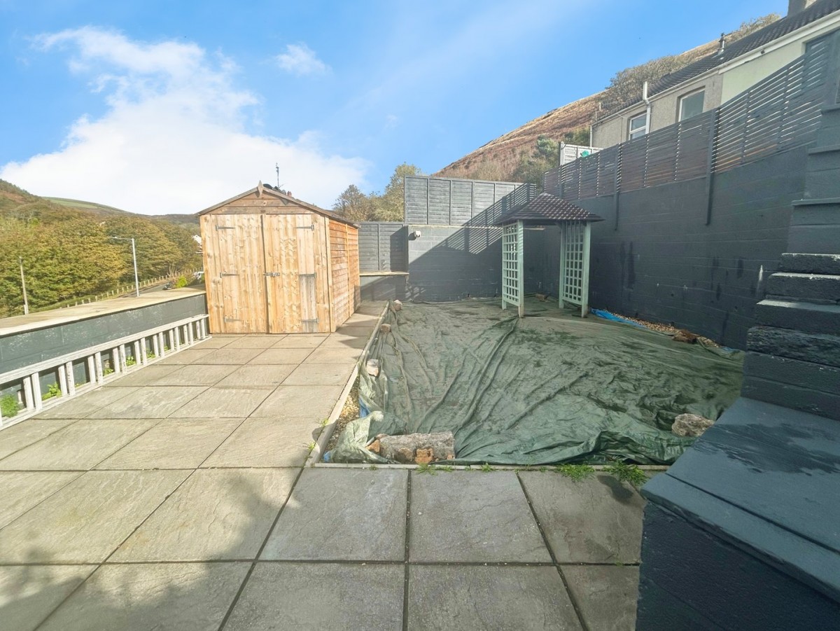Stone paved terrace ideal for garden furniture which leads to the side of the property. Two hard standing parking spaces to the rear. The front of the property is bounded by dry stone wall and wood feather edge fencing with an area laid to stone paved sun terrace with a side wooden gate giving access to the lane. Steps lead down to large area with wooden storage shed and stone paved area with gravel bed. Further steps lead down to lawned area.