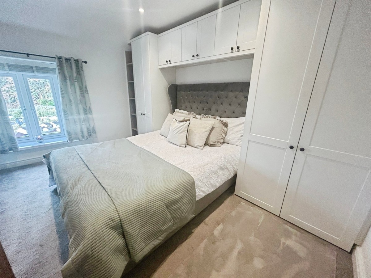 Emulsioned and coved ceiling with inset spot lights, access to loft, emulsioned walls, PVCu double glazed panel overlooking the rear of the property with fitted Venetian blind and fitted carpet. Double door storage cupboard housing gas fired combination boiler.
