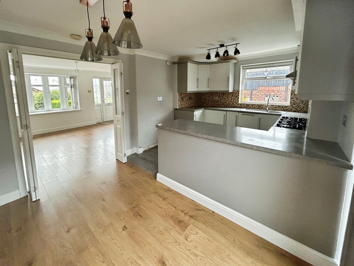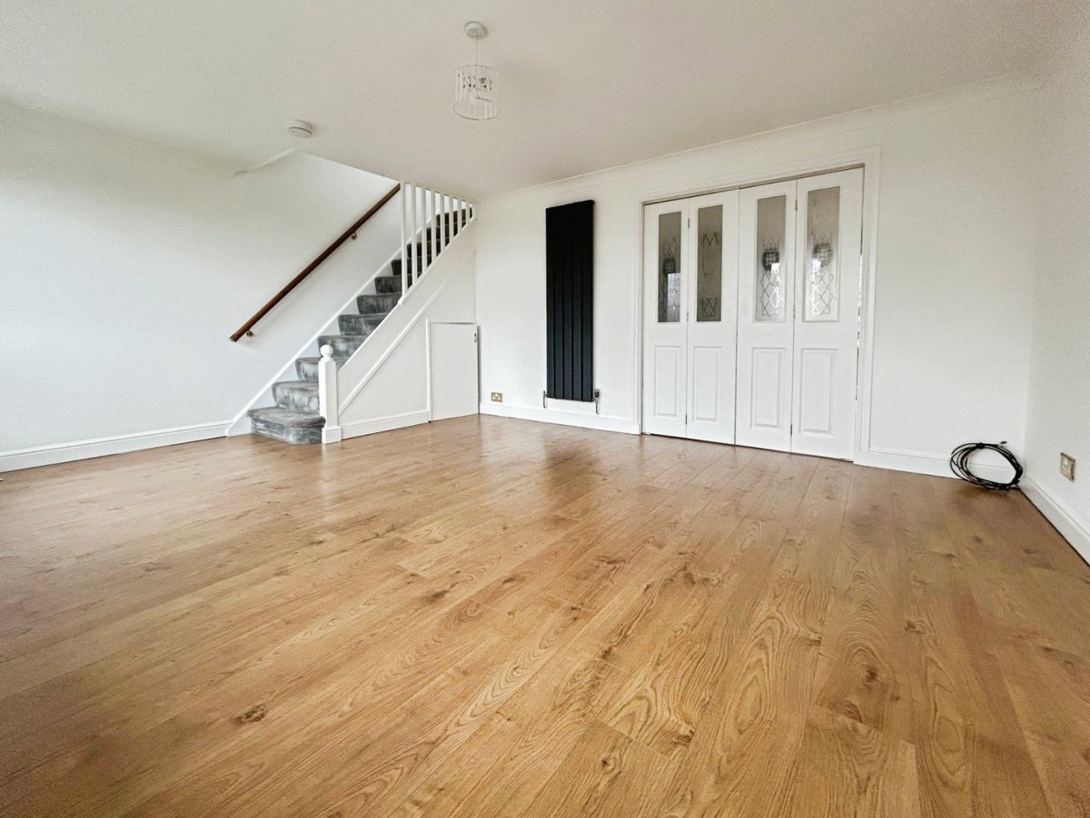 3.96m x 5.08m (13' 0" x 16' 8") Skimmed ceiling, emulsioned walls, PVCu double glazed window set within a bay overlooking the front of the property, vertical radiator and wood effect laminate flooring. Stairs leading to the first floor with fitted carpet. Doors leading through to the kitchen/diner.