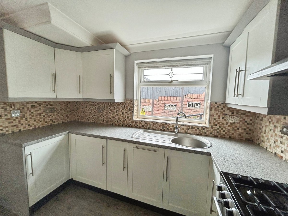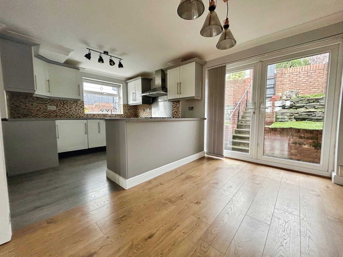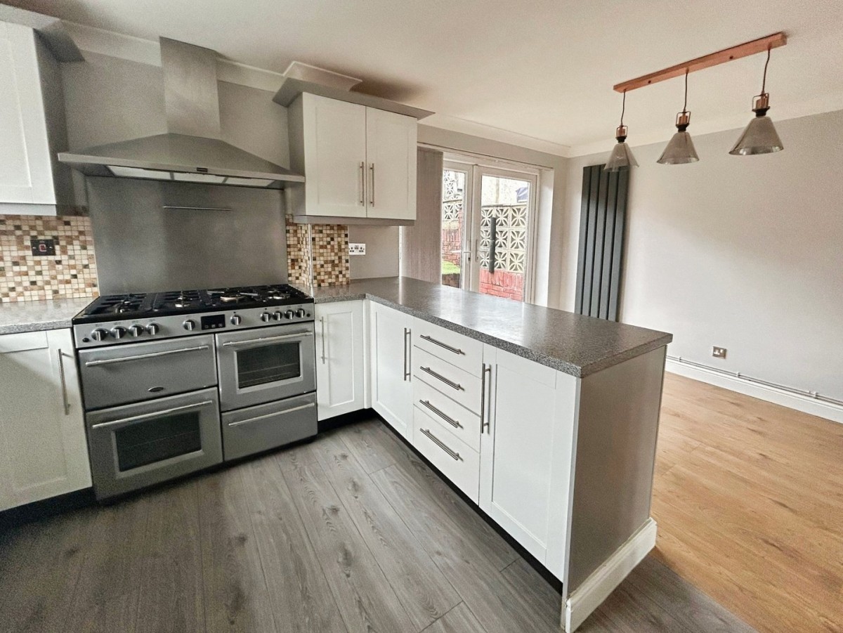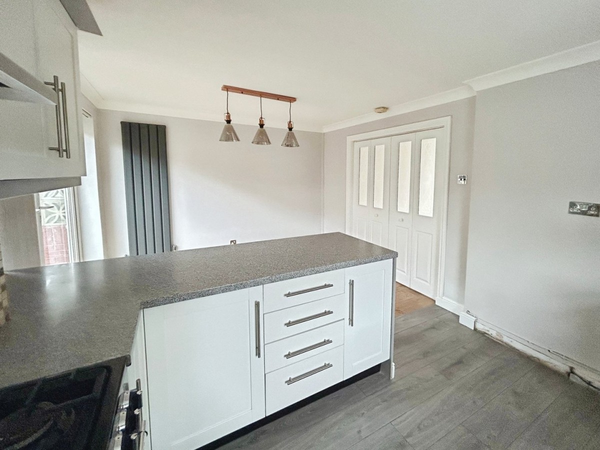 3.16m x 5.09m (10' 4" x 16' 8") Skimmed and coved ceiling, emulsioned walls, side facing PVCu double glazed window and PVCu double glazed French doors leading out to the rear garden and vertical radiator. Tiling to the splash back areas, to the dining area there is a continuation of the wood effect laminate flooring and grey wood effect laminate flooring to the kitchen area. The kitchen is fitted with a range of wall and base units with complementary work surfaces housing a stainless steel sink and drainer. Built in dishwasher, space for freestanding Range cooker, washing machine and up right fridge/freezer. Ample space for dining table and chairs.