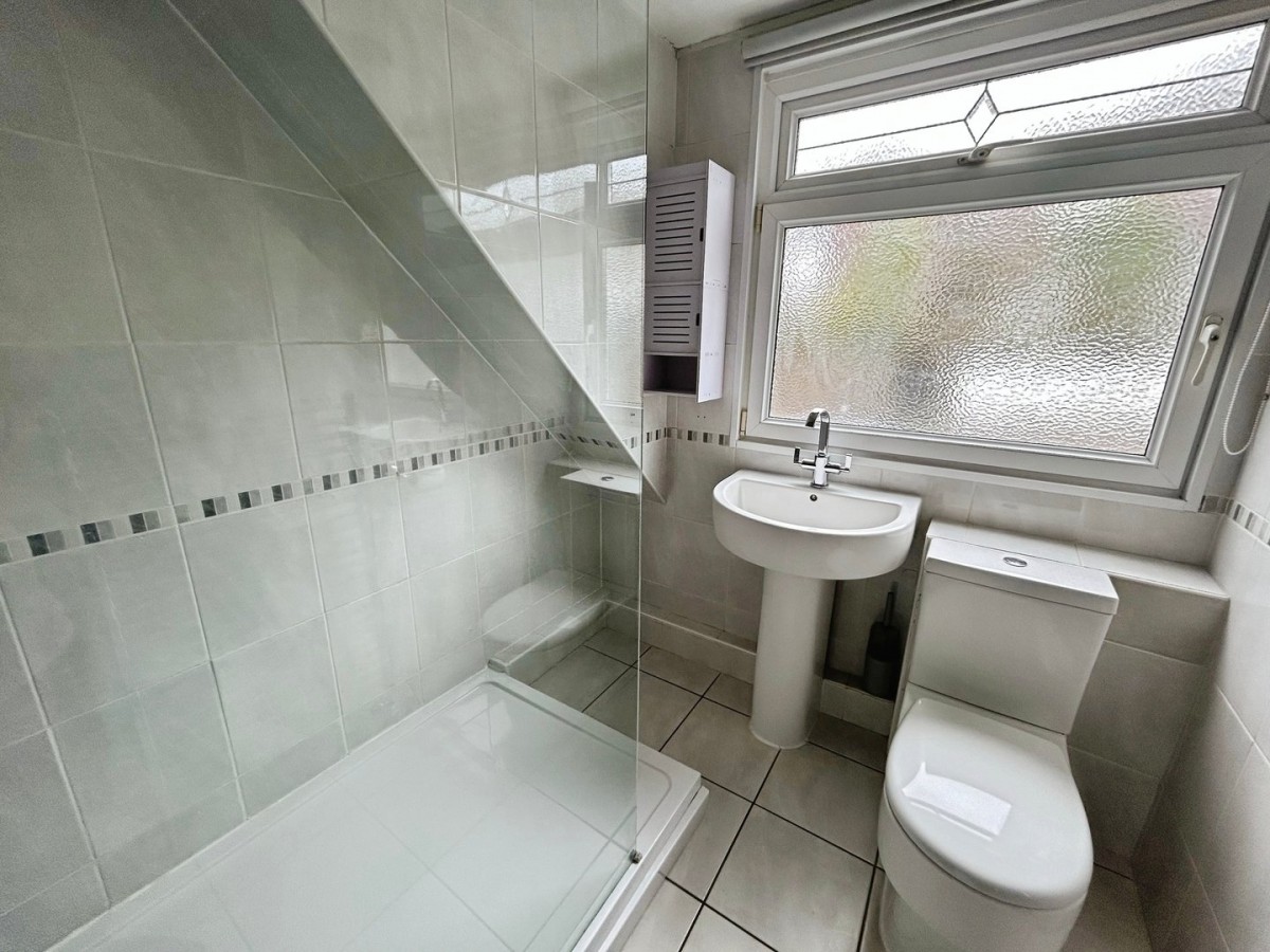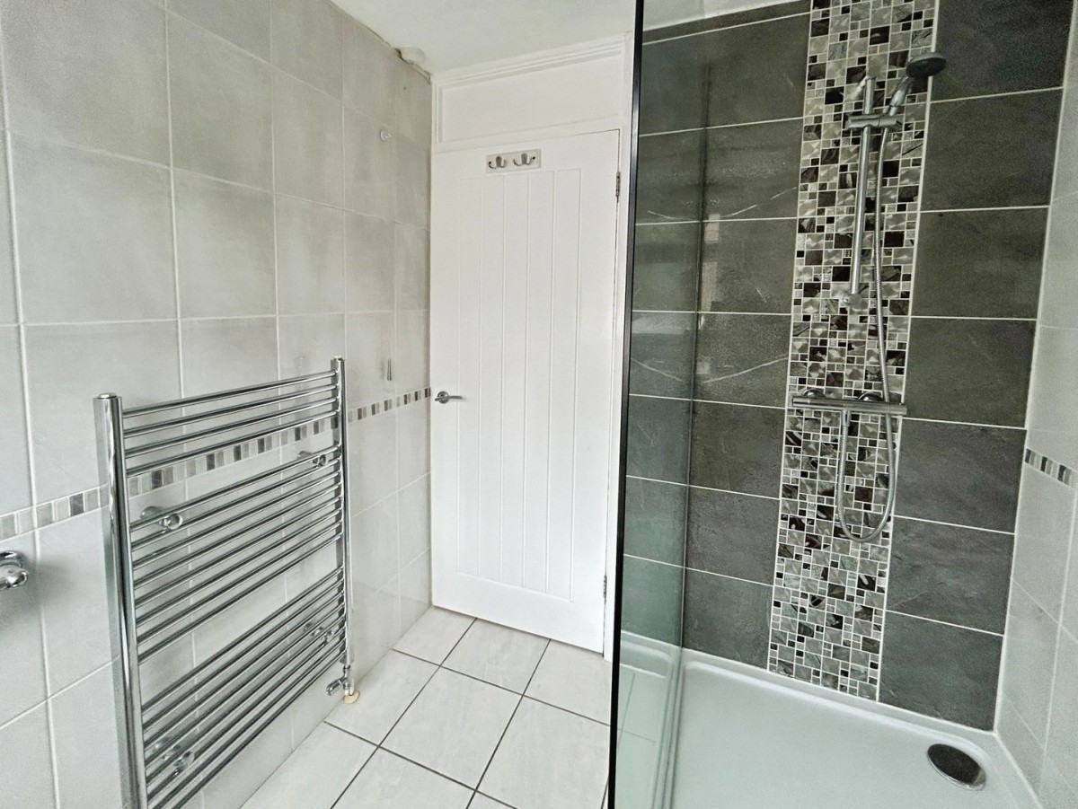 2.17m x 1.92m (7' 1" x 6' 4") Papered ceiling, floor to ceiling ceramic tiled walls, wall mounted chrome towel rail heater, tiled flooring and PVCu frosted double glazed window to the front. Three piece suite comprising low level w.c. pedestal wash hand basin, walk in shower with a wall mounted mains fed chrome shower and shower screen.
