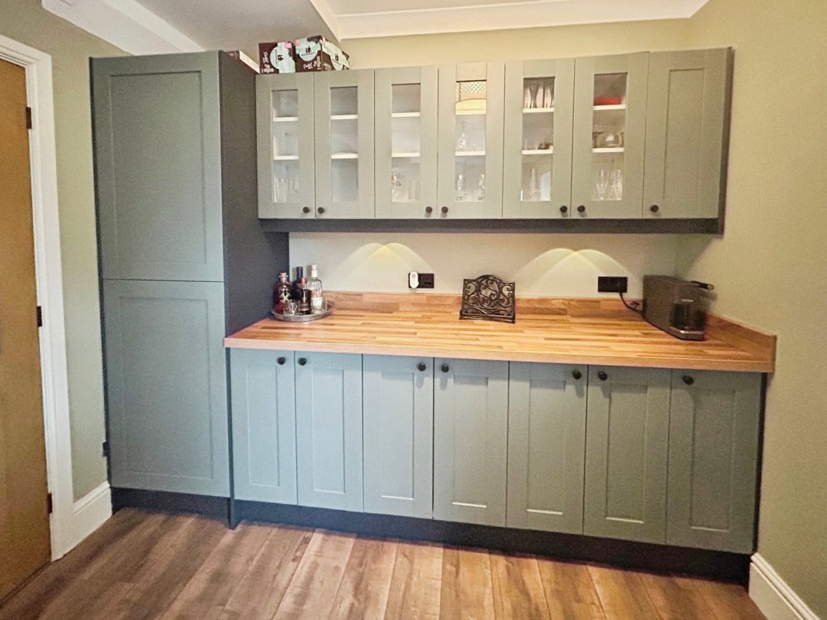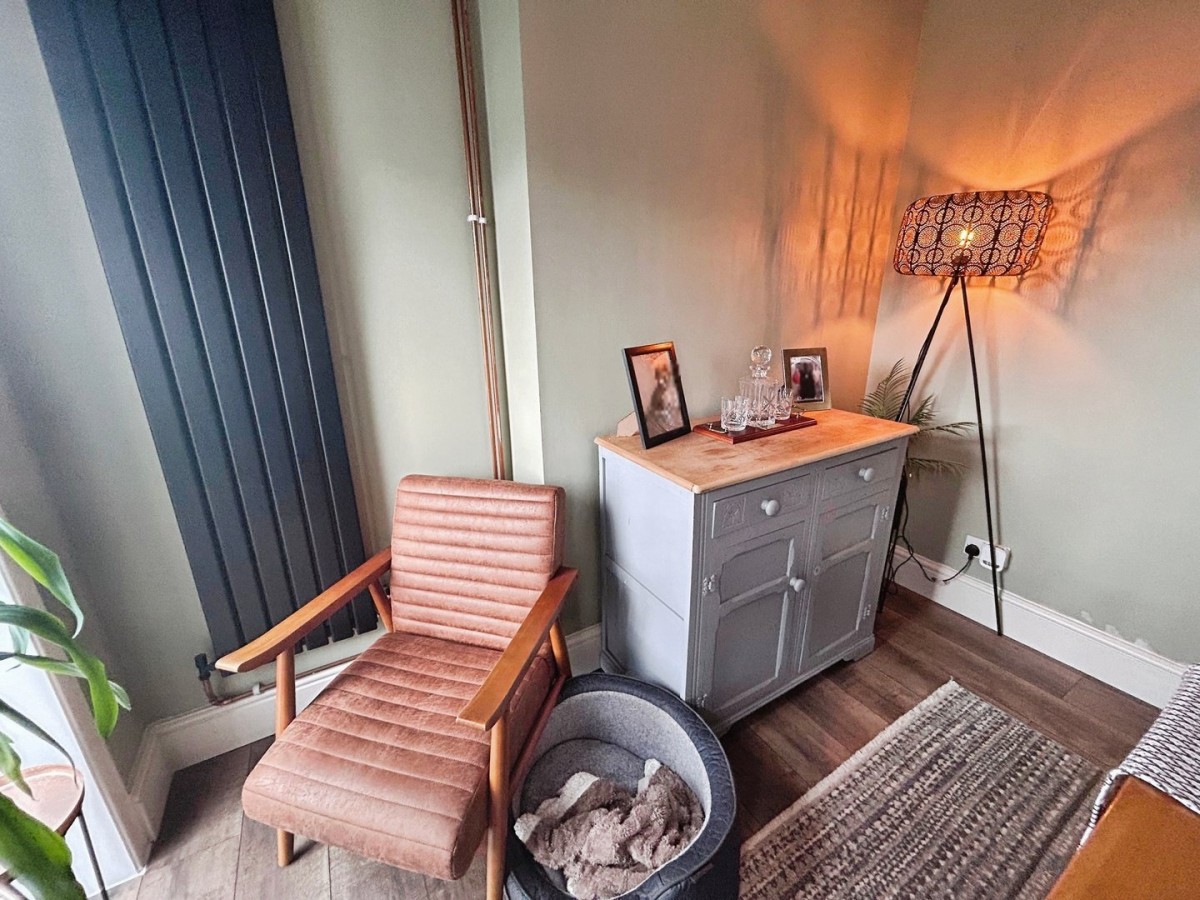Reception Room 2 5.41m x 2.79m (17' 9" x 9' 2") Emulsioned and coved ceiling with two pendant lights, emulsioned walls, designer wall mounted black matt radiator and a continuation of the wood effect laminate flooring from the hallway. PVCu double glazed door leading out to the rear garden with full length PVCu double glazed panel. Fitted storage to one wall, comprising wall and floor units in sage green with laminate worktop. Door leading into the kitchen.