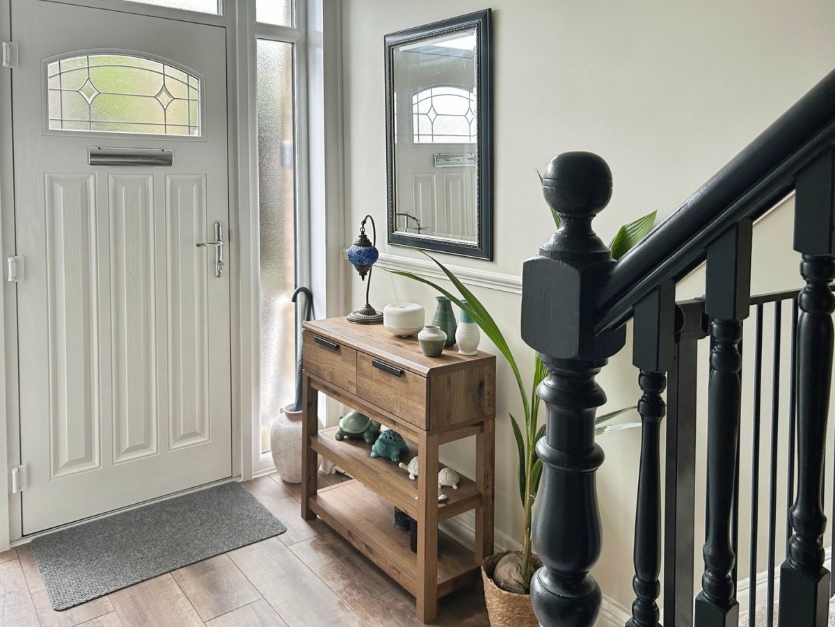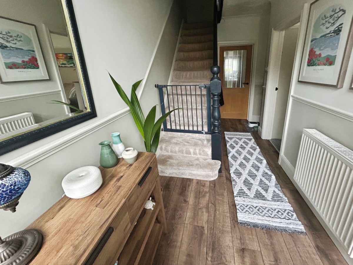 Entrance Via composite part glazed PVCu door with two frosted double glazed side panels and over head panel into the entrance hall. Entrance Hall Artexed ceiling with pendant light, emulsioned walls with dado rail, radiator, wood effect laminate flooring, stairs leading to the first floor and doors leading off.