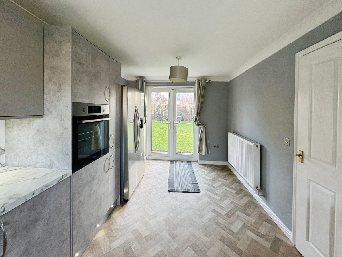 2.71m x 5.70m (8' 11" x 18' 8") Skimmed, emulsioned and coved ceiling with two sets of ceiling lights, skimmed and emulsioned walls and radiator, Dual aspect PVCu double glazed window to the front and PVCu French doors leading to the rear garden. Newly installed Wren kitchen comprising a range of wall and base units with coordinating marble effect work surfaces and matching up stands with under counter lighting and spot lights to the plinths. Integrated appliances include an automatic washing machine, dishwasher, gas hob with over head extractor hood and oven. Space for fridge/freezer and dining table and chairs. Vinyl flooring in Herringbone wood effect.