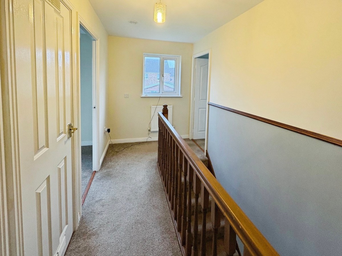 Via stairs with fitted carpet and wooden spindle balustrade. Skimmed and emulsioned ceiling with ceiling light, smoke detector and access to the loft which is partially boarded for storage. Skimmed and emulsioned walls, radiator, fitted carpet and PVCu double glazed window overlooking the rear of the property. Built in storage housing a gas fired combination boiler. Doors leading off.