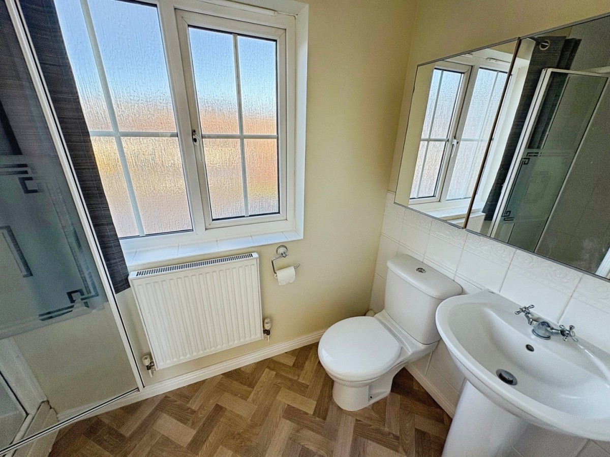 1.17m x 1.76m (3' 10" x 5' 9") Skimmed and emulsioned ceiling with ceiling light, skimmed and emulsioned walls, radiator, PVCu frosted double glazed window overlooking the rear of the property. Two piece suite comprising low level w.c. pedestal wash hand basin with tiling to the splash back and vinyl flooring in Herringbone wood effect.