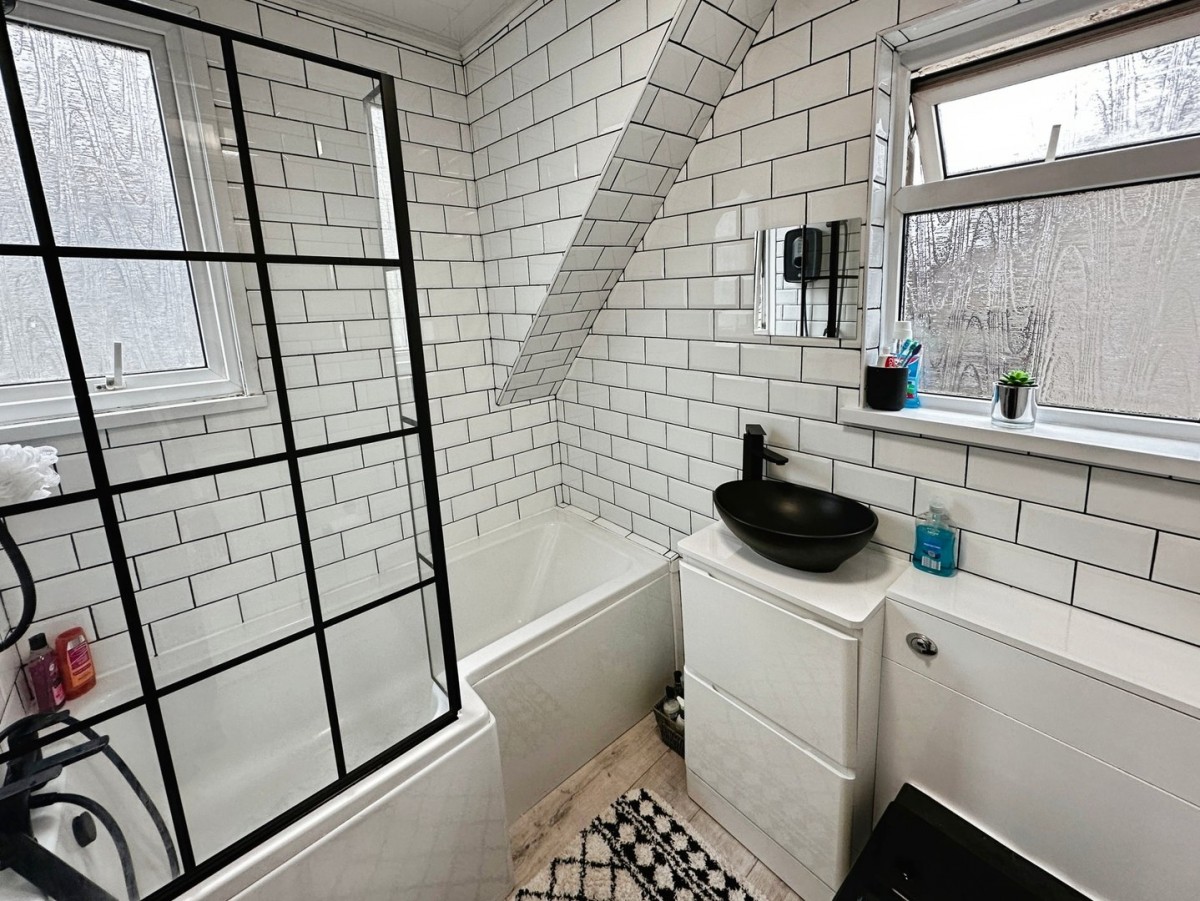 Window to the side and rear, radiator and tile effect flooring. Three piece suite comprising low level w.c. electric shower with tiled walls and panelled bath.