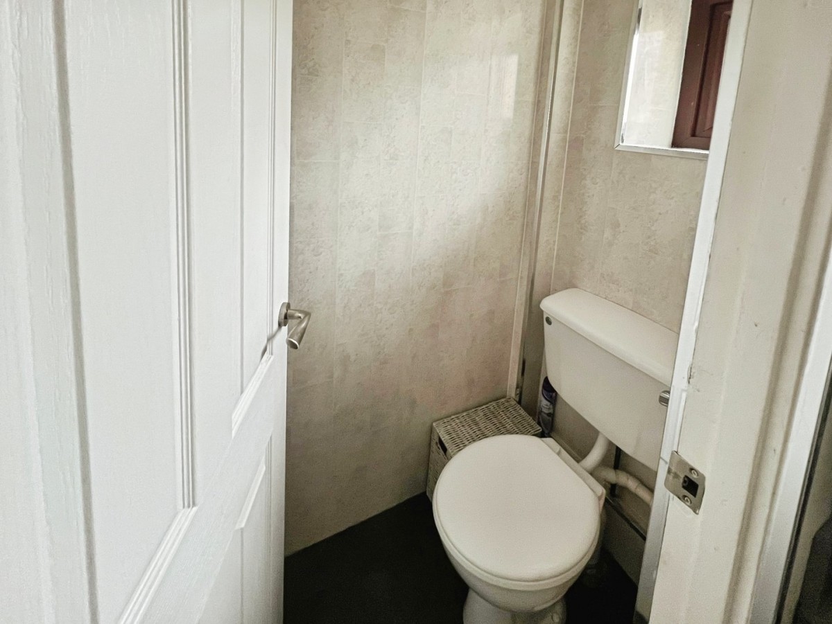 PVCu panelling to ceiling, respatex walls, front facing frosted PVCu double glazed window, radiator and tile effect flooring. Three piece suite comprising pedestal wash hand basin, low level w.c. and shower unit with electric shower attachment.