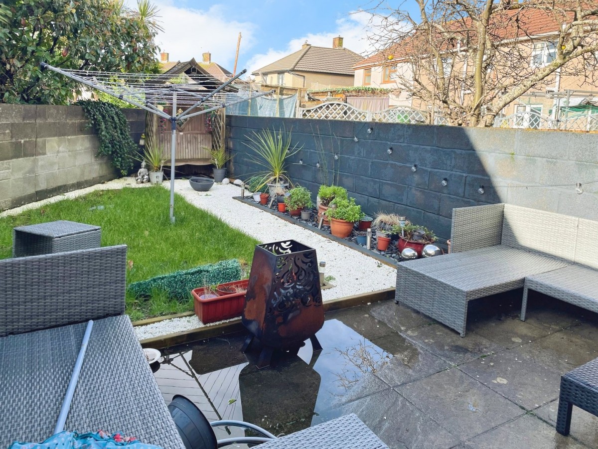 The rear garden is laid to paving and lawned areas with slate chippings and garden shed. Retaining brick wall and space to the side for recycling storage. Gate leading to the front.