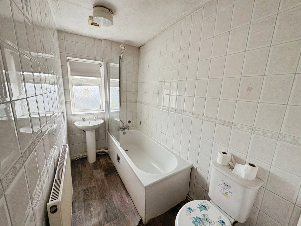 1.41m x 2.55m (4' 8" x 8' 4") Artexed ceiling, ceiling light, tiled walls, radiator, frosted PVCu window overlooking the front of the property and vinyl flooring. Three piece suite comprising low level WC, pedestal wash hand basin and panelled bath with overhead shower and glass shower screen.