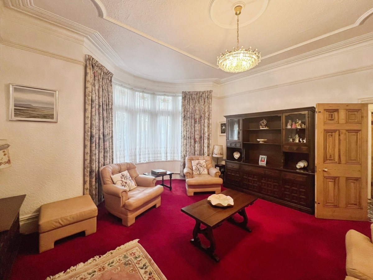 Papered ceiling with original coving, papered walls with dado rail, PVCu double glazed window to the front of the property set within a bay, radiator and fitted carpet. The focal point to the room is the tiled hearth and wooden surround and mantle with onset electric fire.