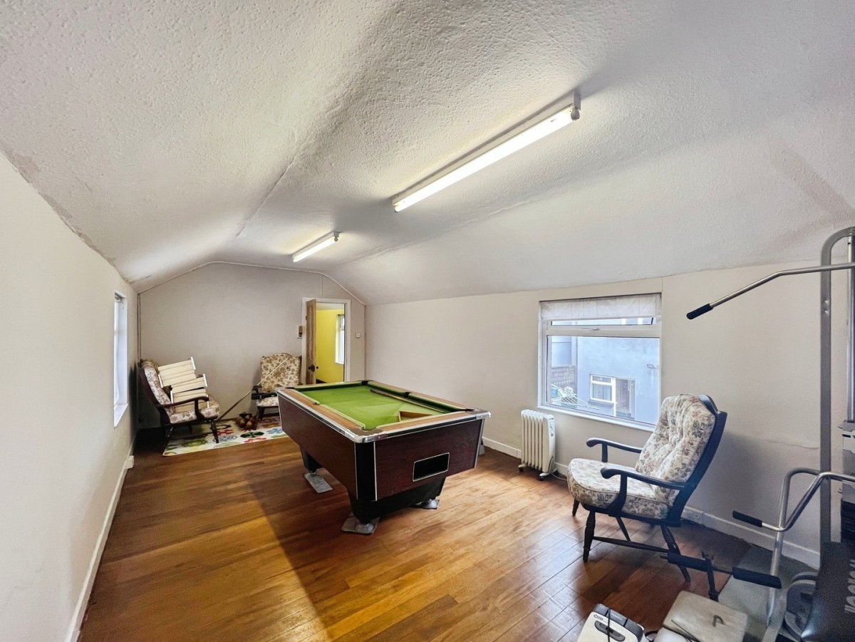 Papered ceiling, emulsioned walls, PVCu double glazed window overlooking the house, fitted carpet tiles and door leading to the gym/home office/playroom.