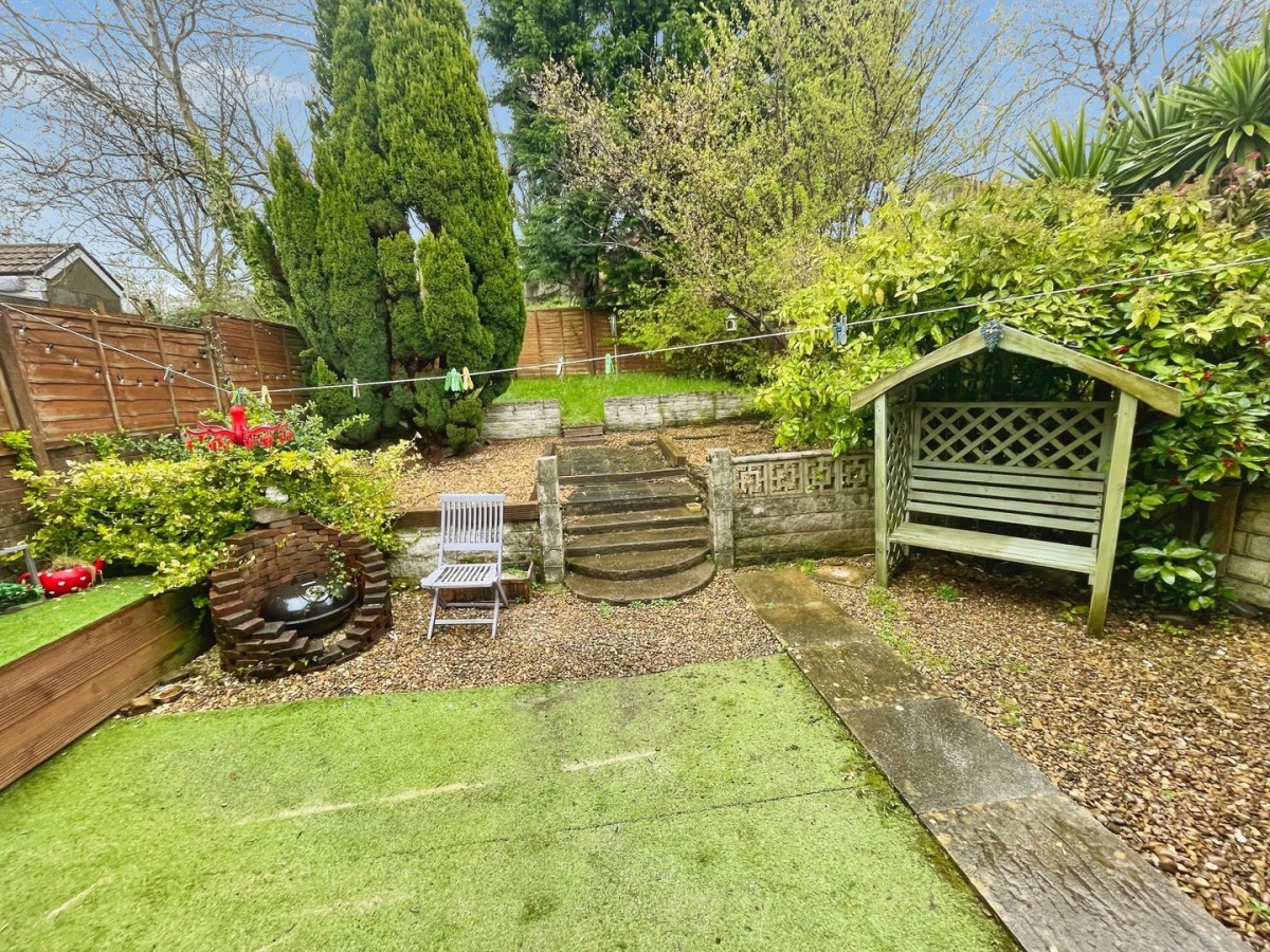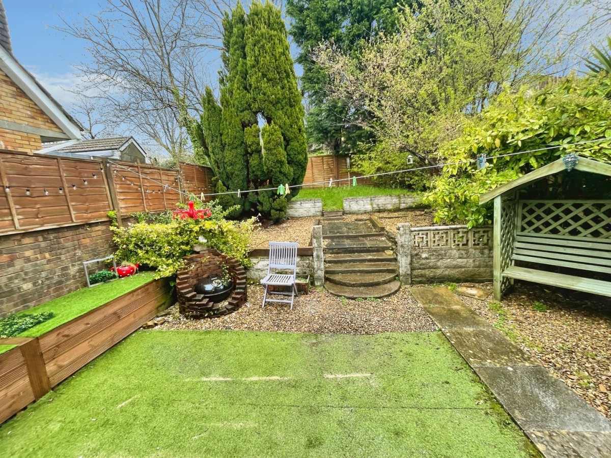 The rear garden is laid to synthetic lawn, Cotswold stone chippings and steps leading up to a further lawned area. Secure panel fencing and a range of trees and shrubs, BBQ pit and gate leading to the front
