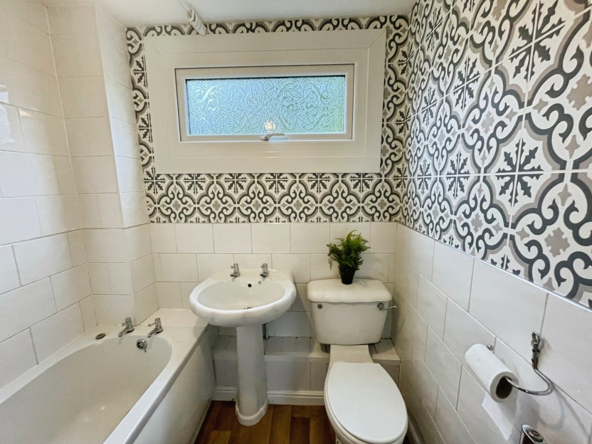 PVCu double glazed opaque window to the rear, part papered / part tiled walls, chrome towel rail and laminate flooring. Three piece suite comprising panelled bath with overhead mains fed shower attachment, pedestal wash hand basin and low level WC.