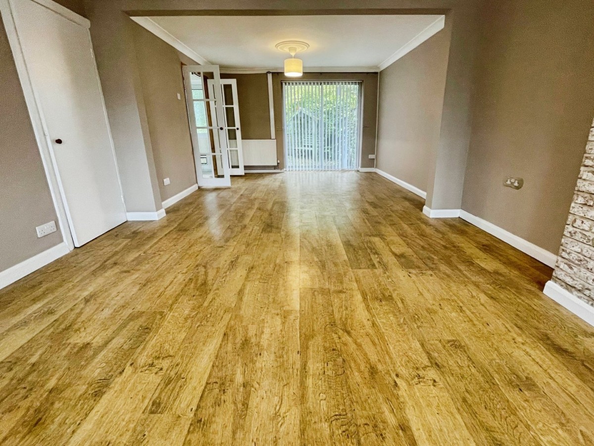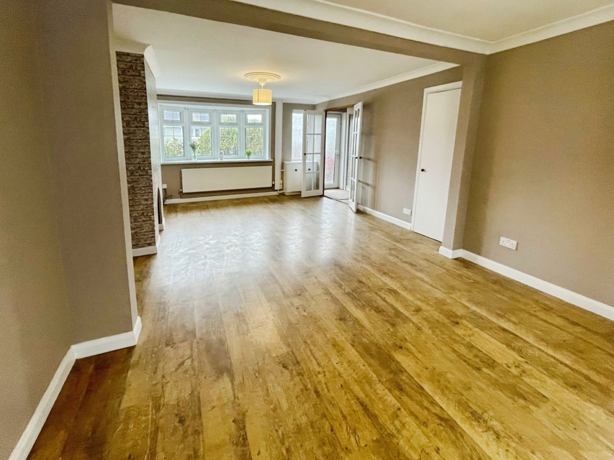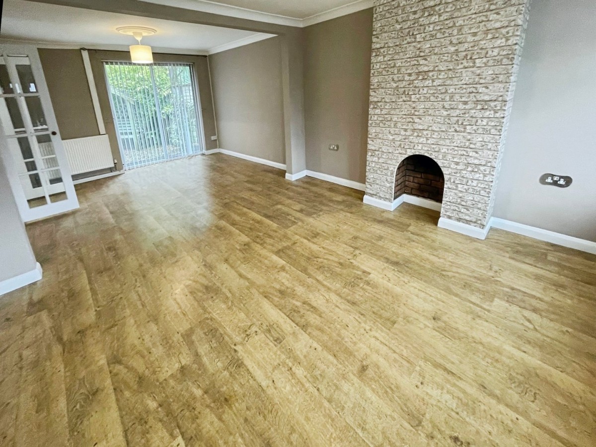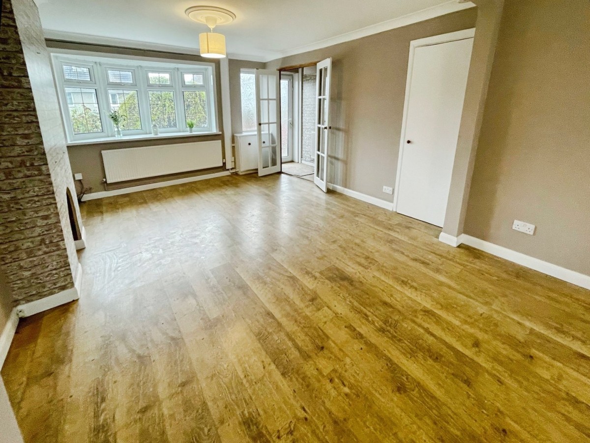 3.65m x 7.42m (12' 0" x 24' 4") Emulsioned walls, coving, , PVCu double glazed bow window to the front, two radiators and aluminium framed patio door leading to the rear. Under stairs storage cupboard and feature fireplace. Two timber framed glazed doors leading into the kitchen.