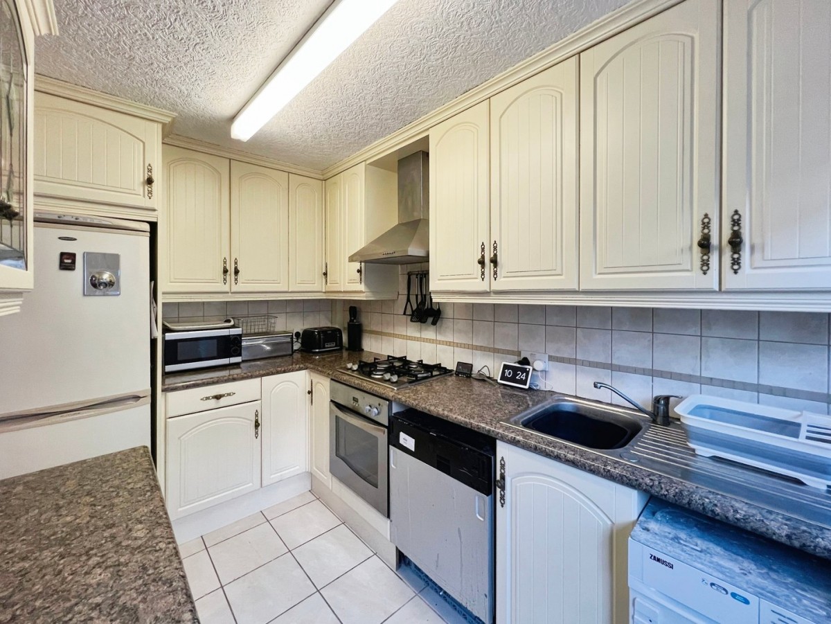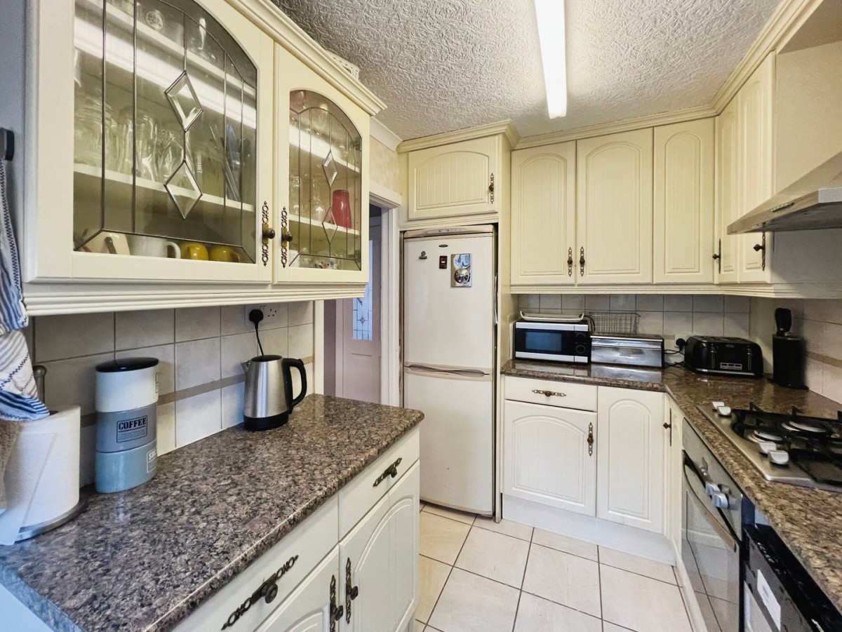 3.15m x 2.09m (10' 4" x 6' 10") Papered ceiling. Part papered part tiled walls. Rear facing PVCu double glazed window and PVCu frosted double glazed door. Radiator. Tiled flooring. Room is fitted with a range of wall and base units with complementary work surfaces. Stainless steel sink and drainer. Built in four ring gas hob and extractor hood. Built in oven below. Space for upright fridge/freezer. Under counter space for two kitchen appliances. Landing Papered ceiling. Coved. Loft access hatch. Papered walls. Dado rail. Side facing PVCu frosted double glazed window. Laminate flooring. Airing cupboard. All doors leading off.