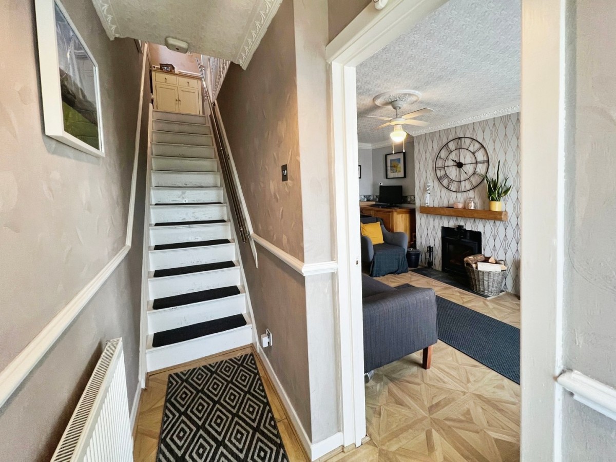 Accessed via a PVCu part glazed door leading into: Porch Skimmed ceiling. PVCu double glazed units. Emulsioned walls. Tiled flooring. PVCu frosted glazed door leading into: Hallway Papered ceiling. Coved. Papered walls. Dado rail. Radiator. Wood effect laminate floor covering. Staircase leading up to first floor accommodation. Door into:
