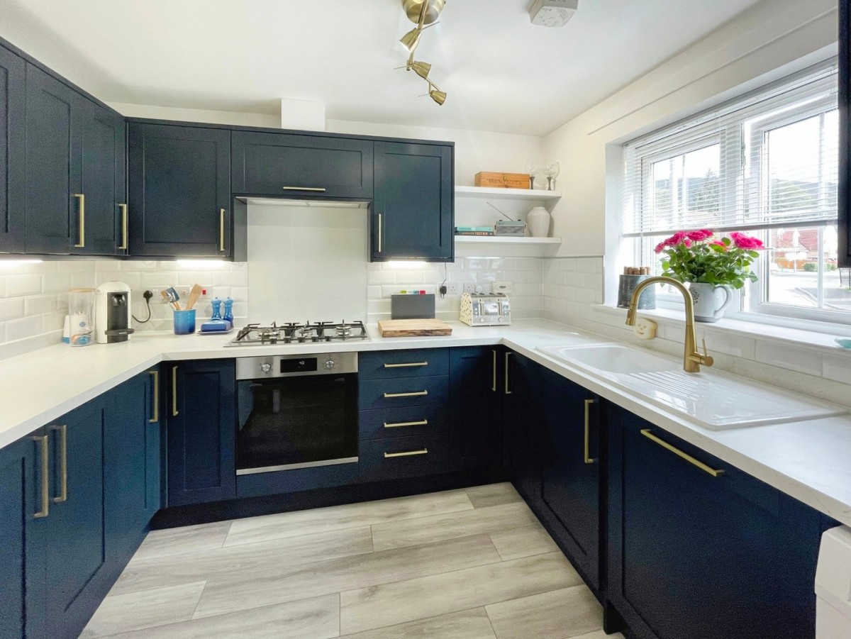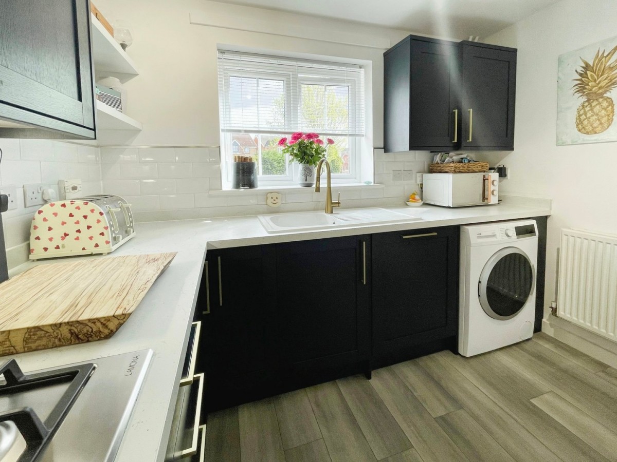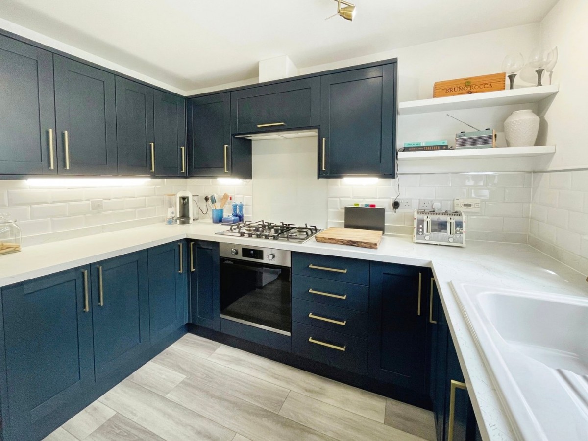 2.96m x 2.86m (9' 9" x 9' 5") Refurbished to a high standard. Skimmed ceiling. Emulsioned walls with modern tiles to splash back areas. Laminate flooring. Radiator. Room is fitted with a range of wall and base units in modern navy finished with brass handles and complimentary work tops. White ceramic sink and drainer with brass mixer tap. Plumbing for automatic washing machine. Space for fridge/freezer. Five ring gas hob with built in electric oven below, glass splashback and overhead concealed extractor hood. One cupboard housing the gas combination boiler. PVCu double glazed window to front of property.
