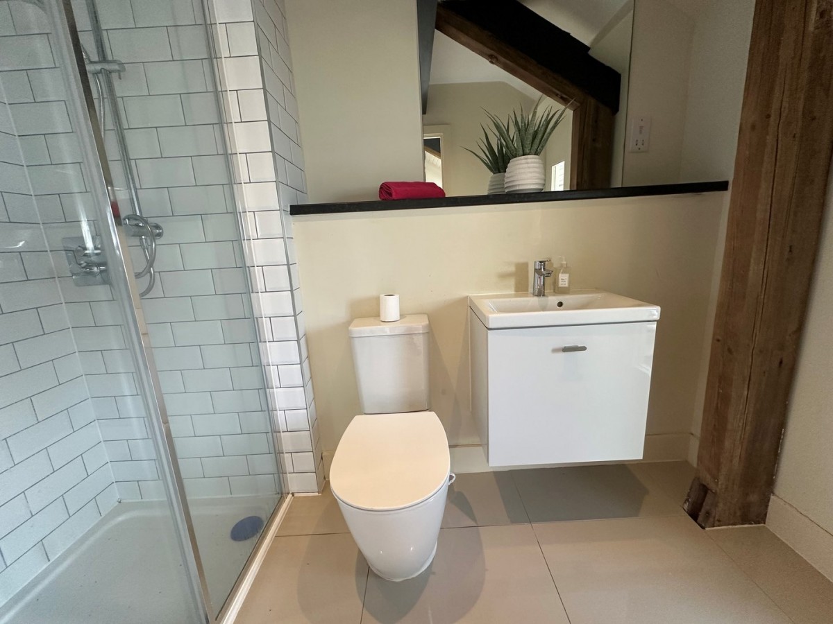 Exposed steal and timber beams, emulsioned walls and porcelain floor. Three piece suite in white comprising w.c. wall mounted wash hand basin with vanity unit and chrome mixer tap and large walk in shower housing a plumbed shower with hand attachment and rainwater head with ceramic tiles to all splash backs.