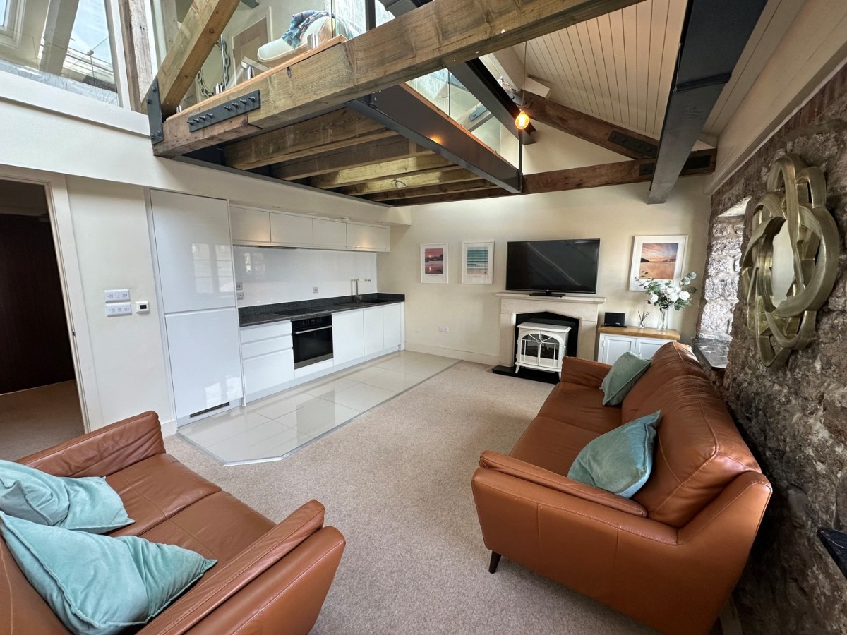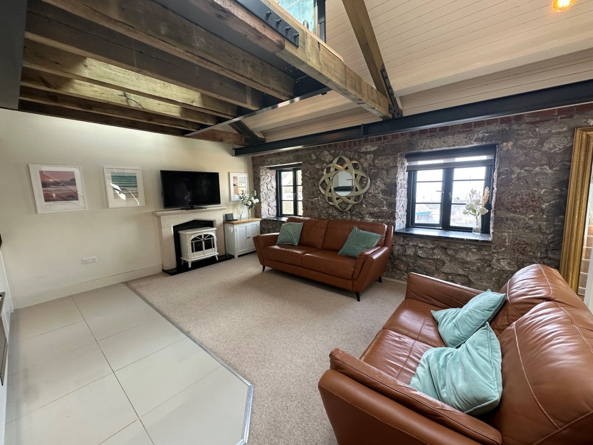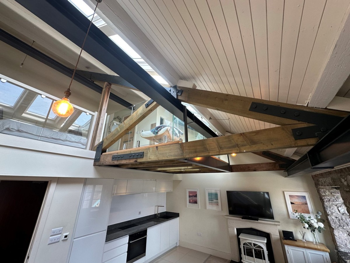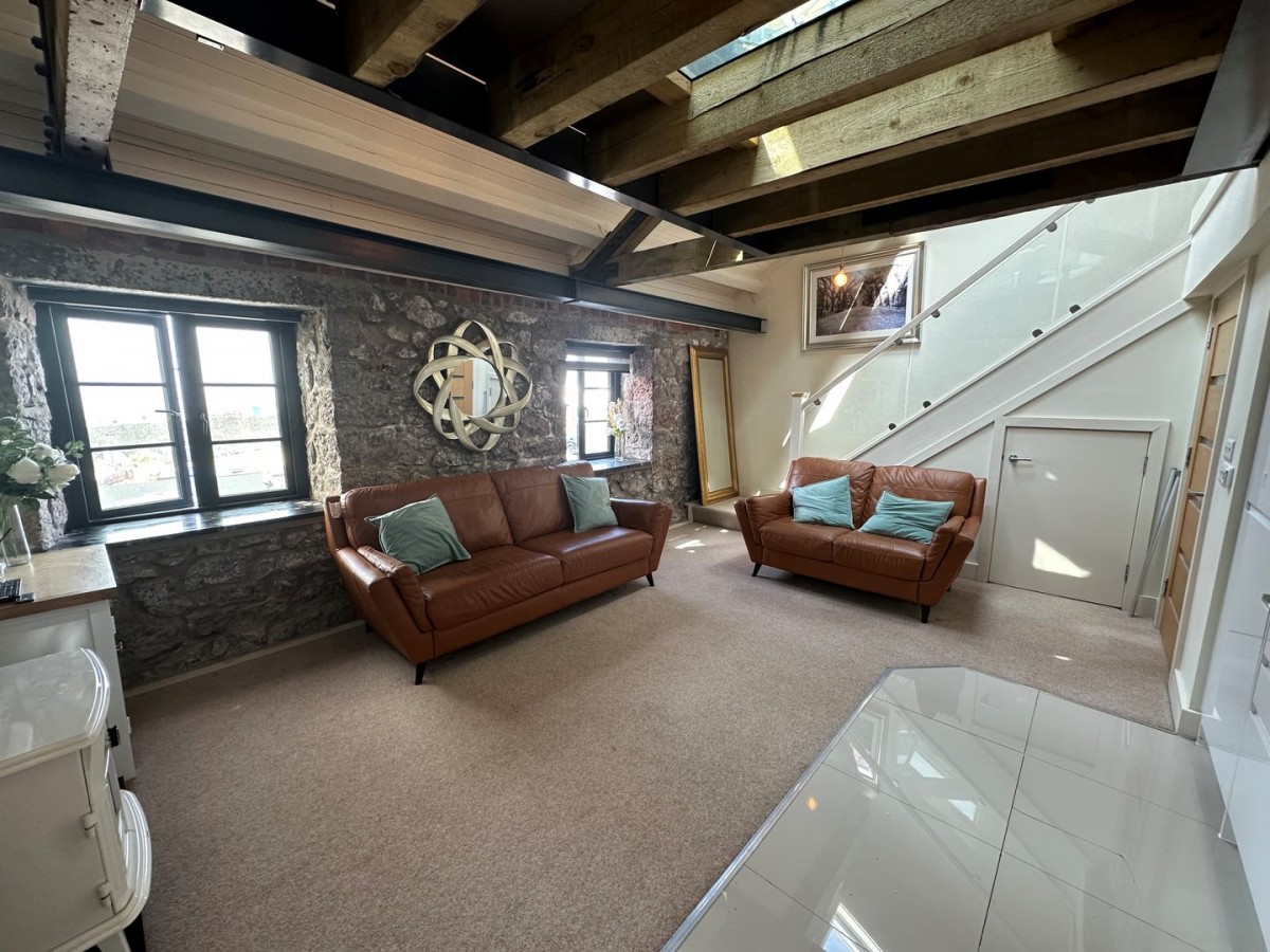 Two double glazed aluminium casement windows both with fitted night and day roller blinds and finished with vaulted apex ceiling with exposed steal and timber beams, one original stone wall with granite window shelves. Emulsioned walls, skirting and porcelain tiles to the kitchen and carpet to the living space.