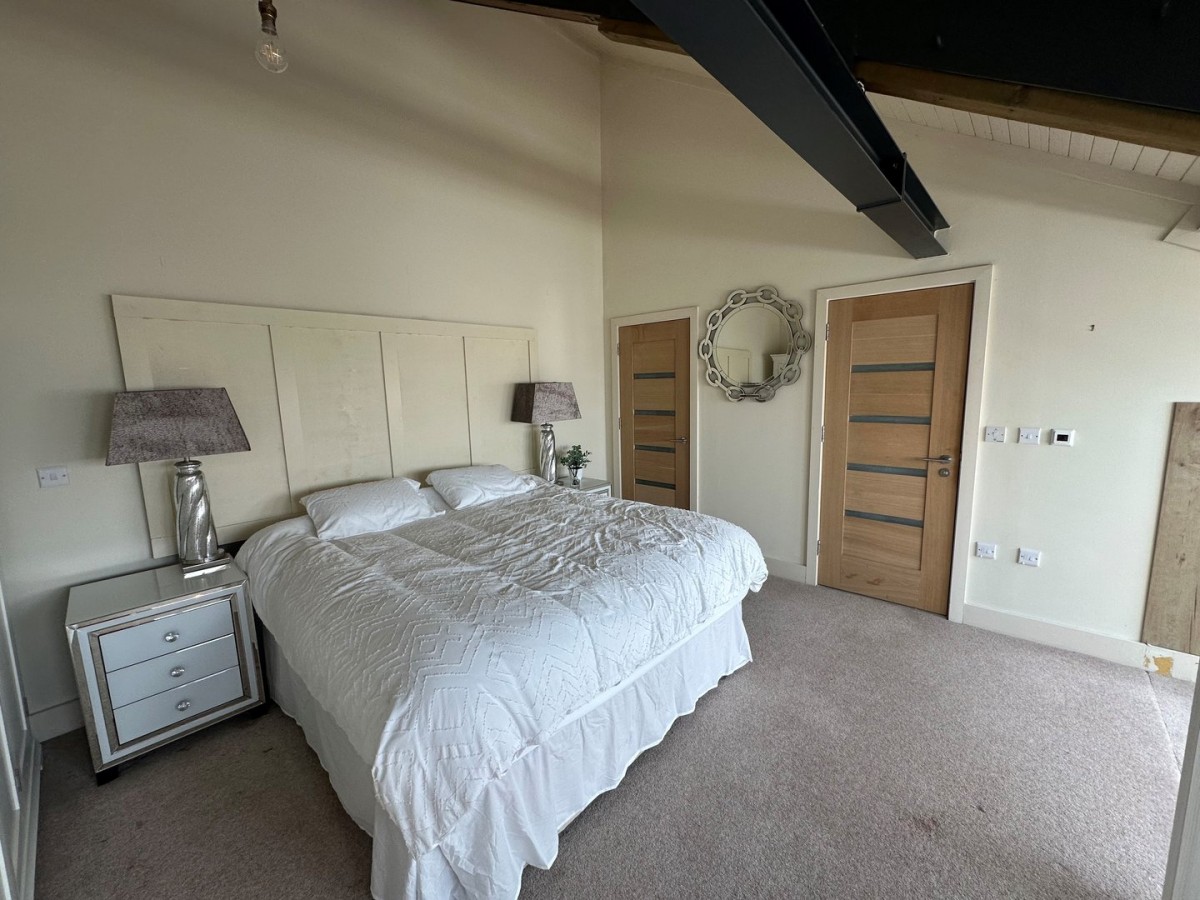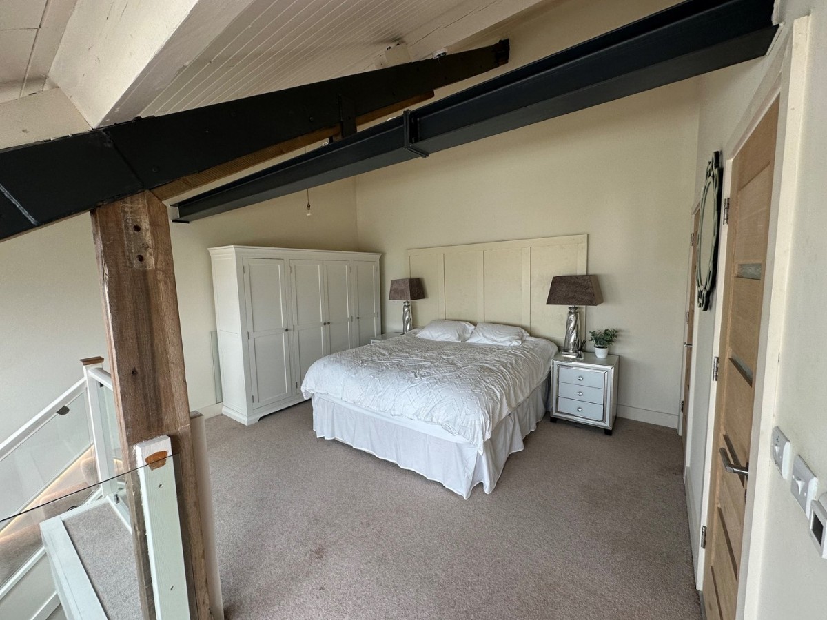 Vaulted ceiling with exposed beams, emulsioned walls, skirting and fitted carpet and wall mounted headboard. Door into fitted storage/walk in wardrobe with access to loft storage and door into the shower room.