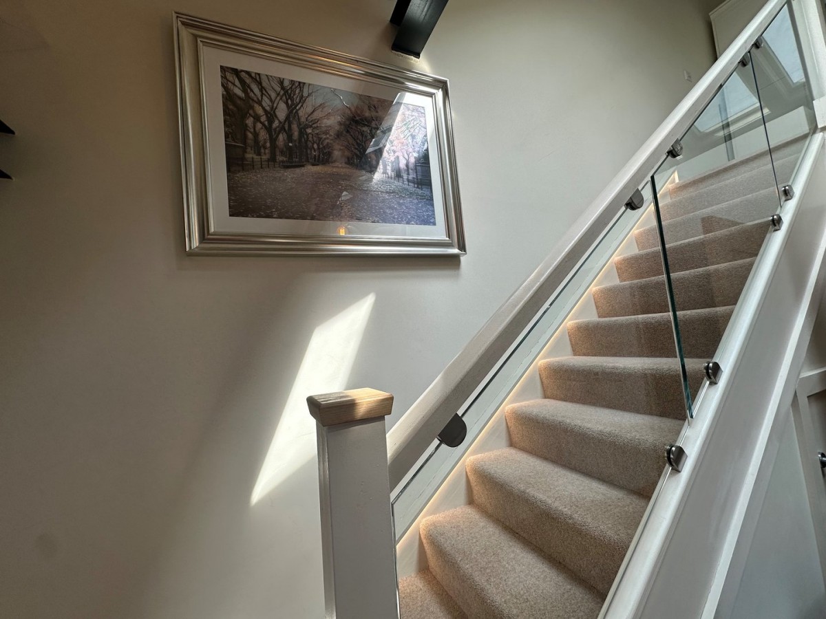 Via stairs with fitted carpet, LED lighting and wooden and glass balustrade.