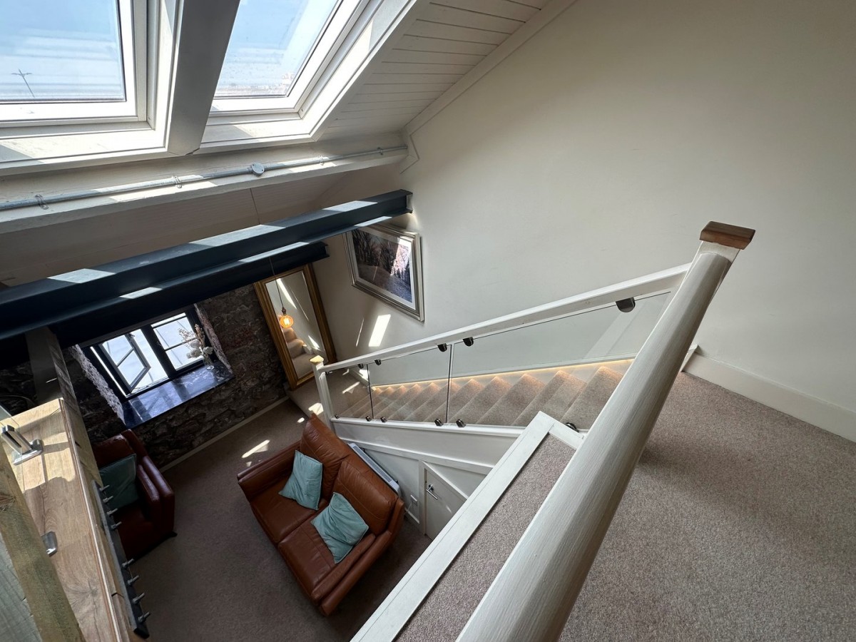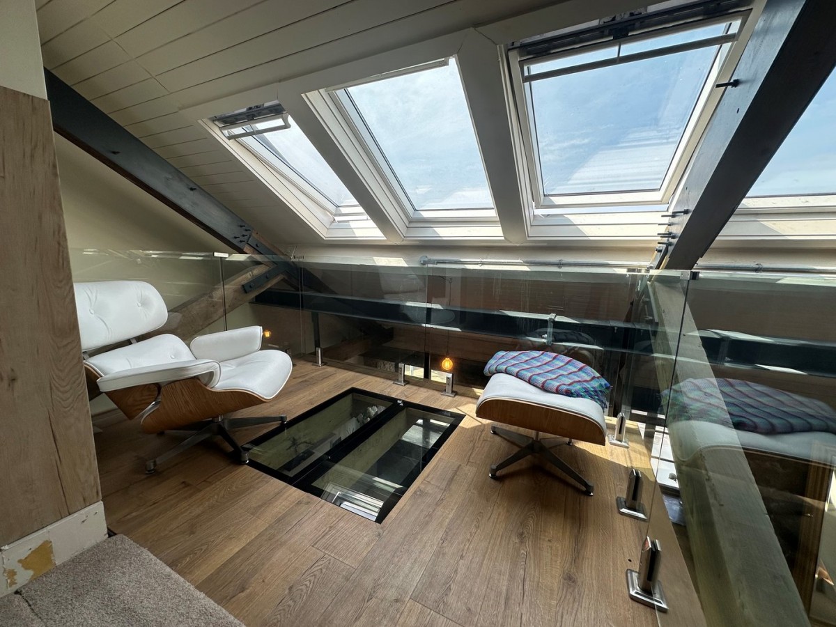 Double glazed velux skylights with views over the sea front enclosed with glazed balustrade and wood effect floor with part glazed floor looking down to the kitchen / living.